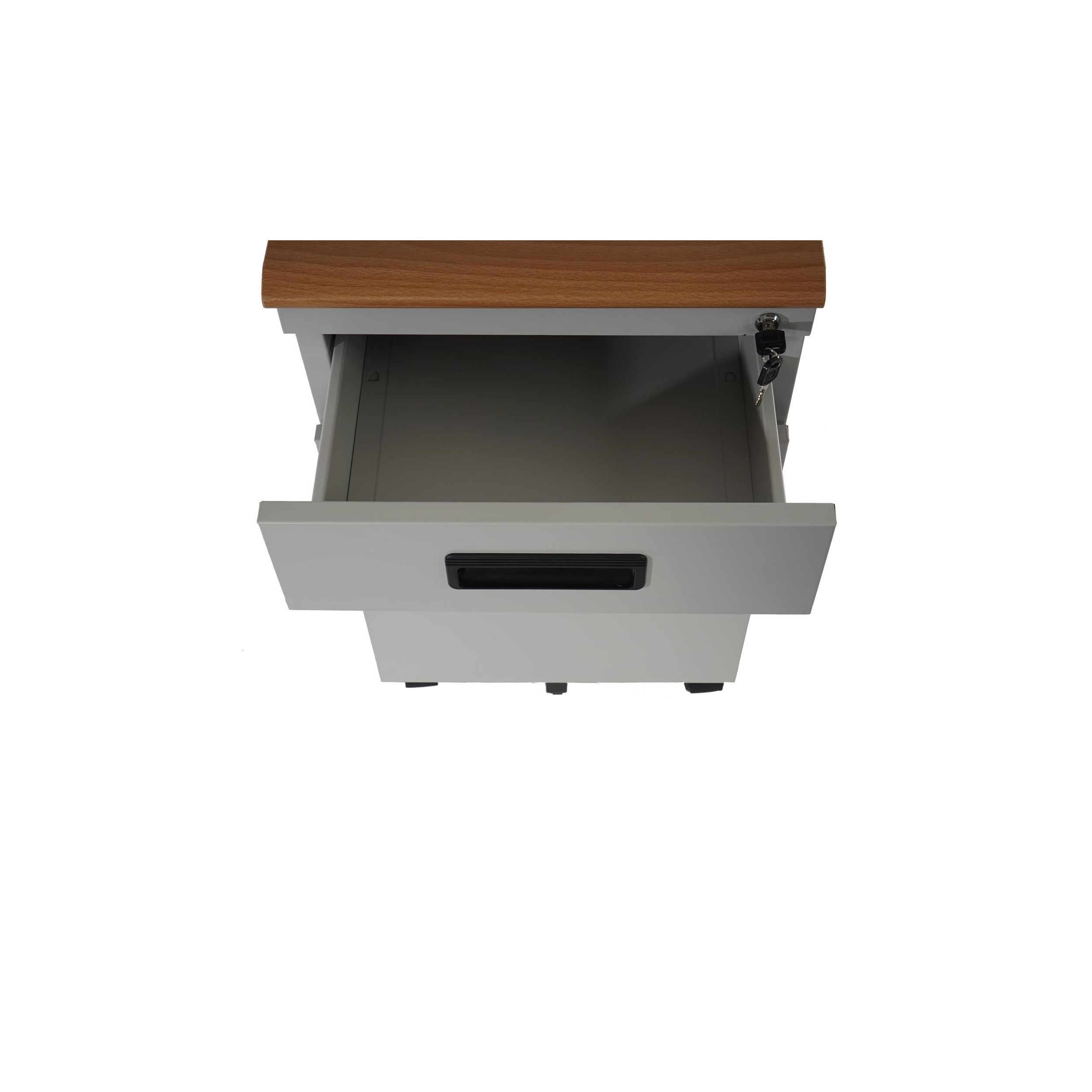 El archivador cuenta con tres espaciosos cajones. Tienen guías telescópicas y son muy estables, por lo que se abren y cierran de forma sencilla y son cómodos de utilizar. Además el cajón superior tiene cerradura. El cajón inferior incorpora una rueda de apoyo para evitar caidas o movimientos indeseados, un detalle muy exclusivo. La capacidad de almacenaje es muy grande, ideal para poder guardar muchos objetos de forma organizada.