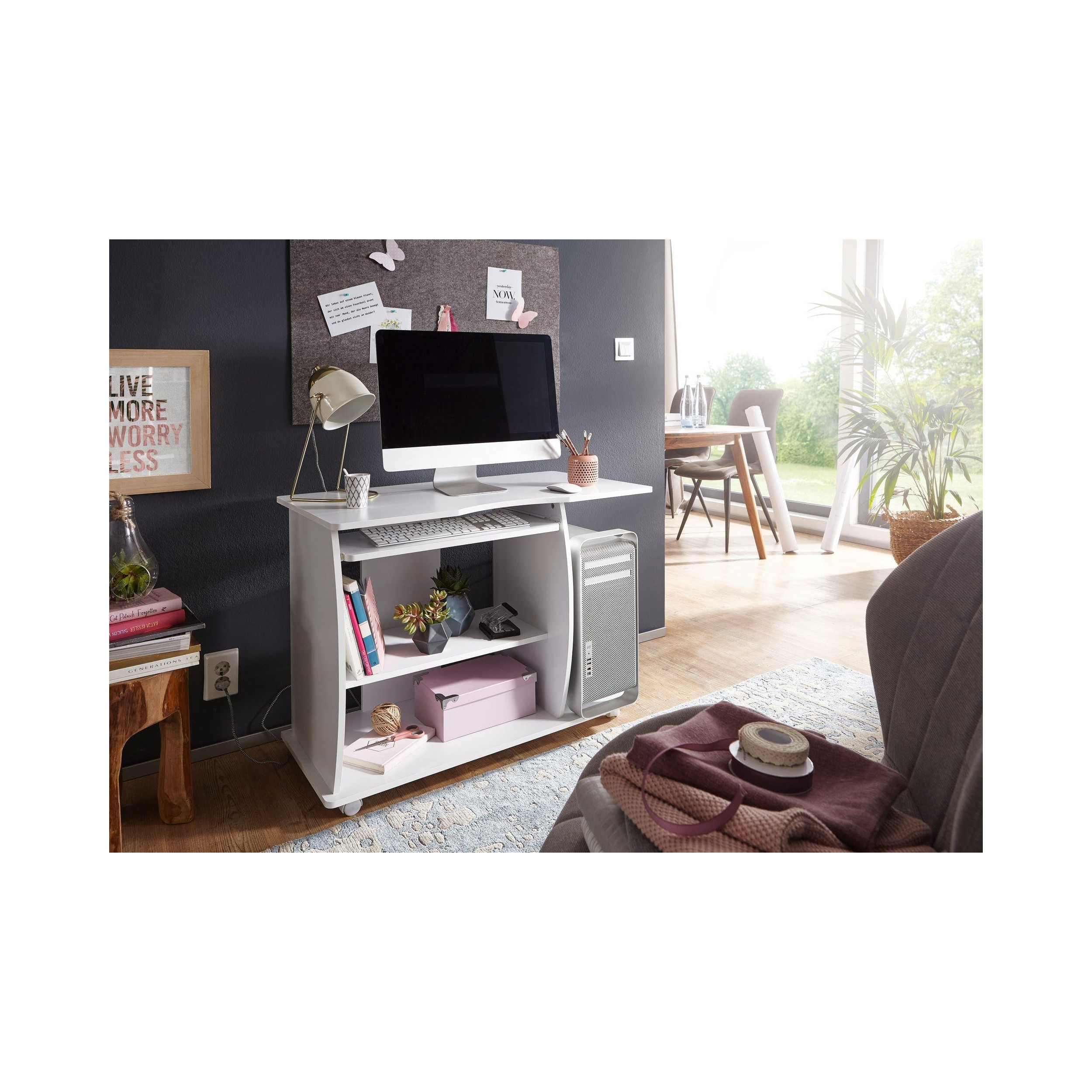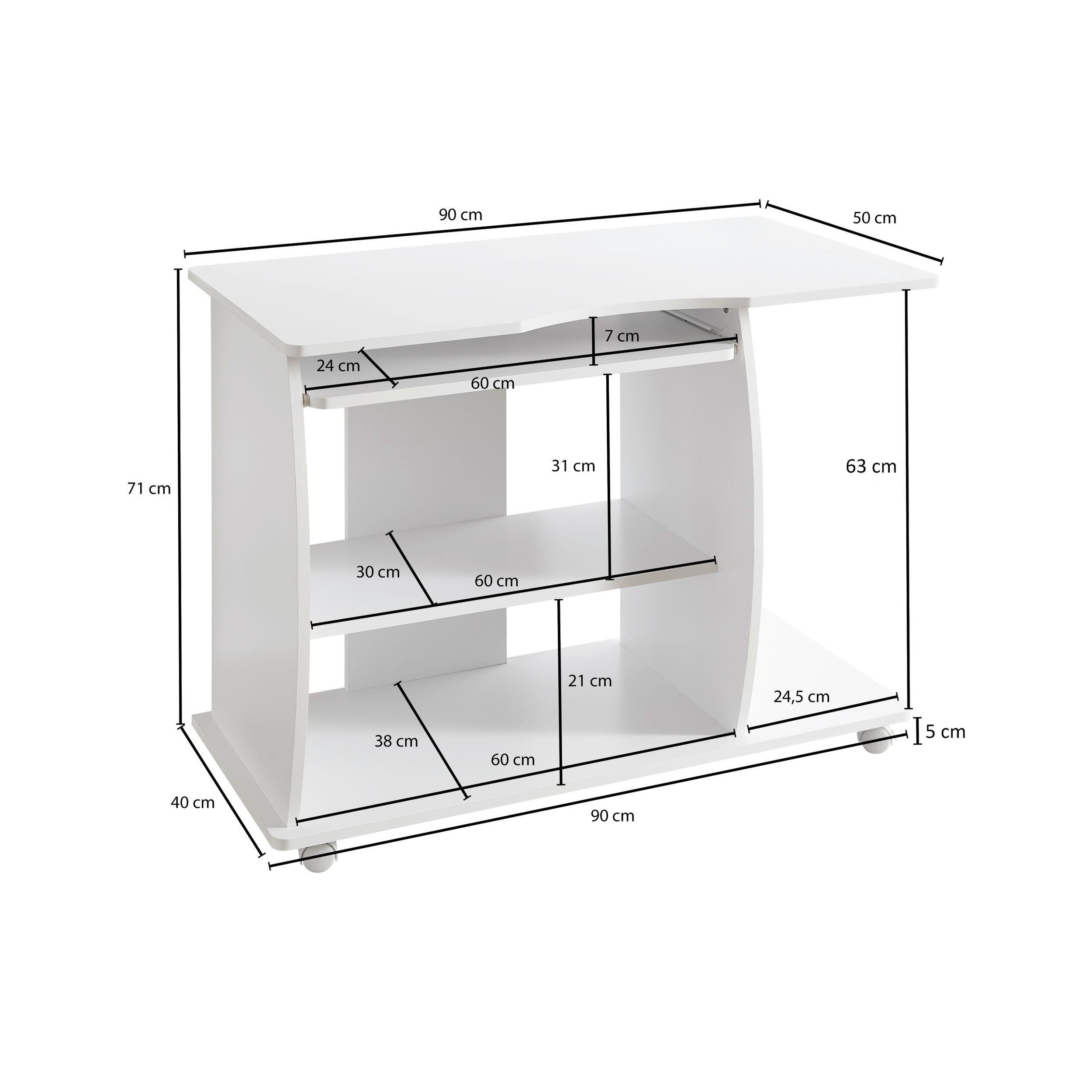 Mesa de Ordenador DUKE en madera, con ruedas y bandeja extraible, tamaño 90x50cm, color Blanco