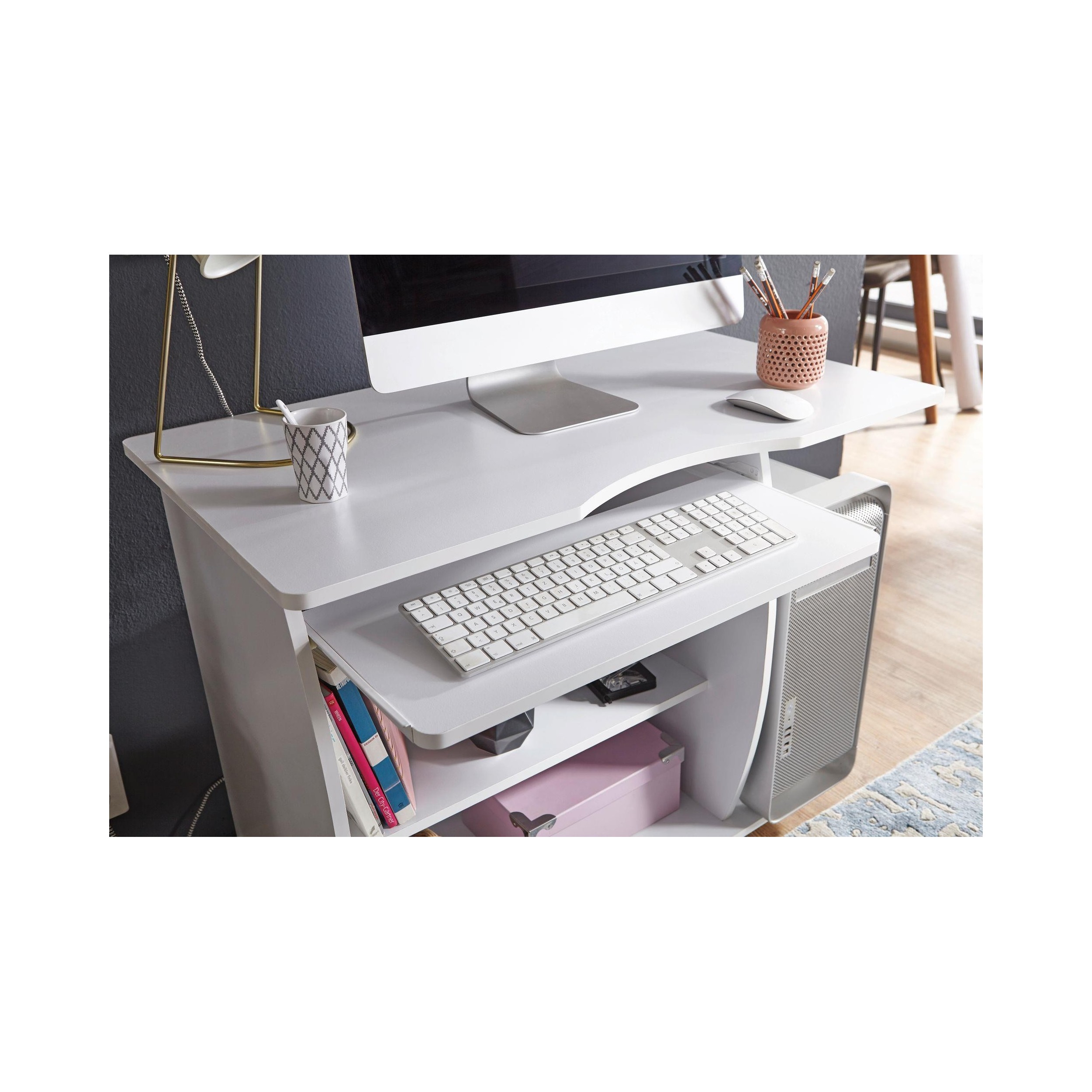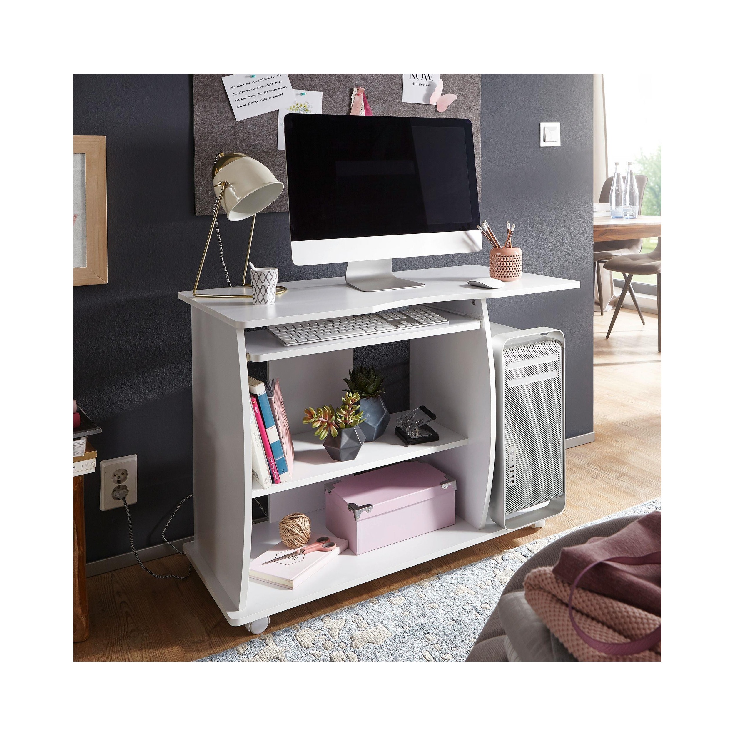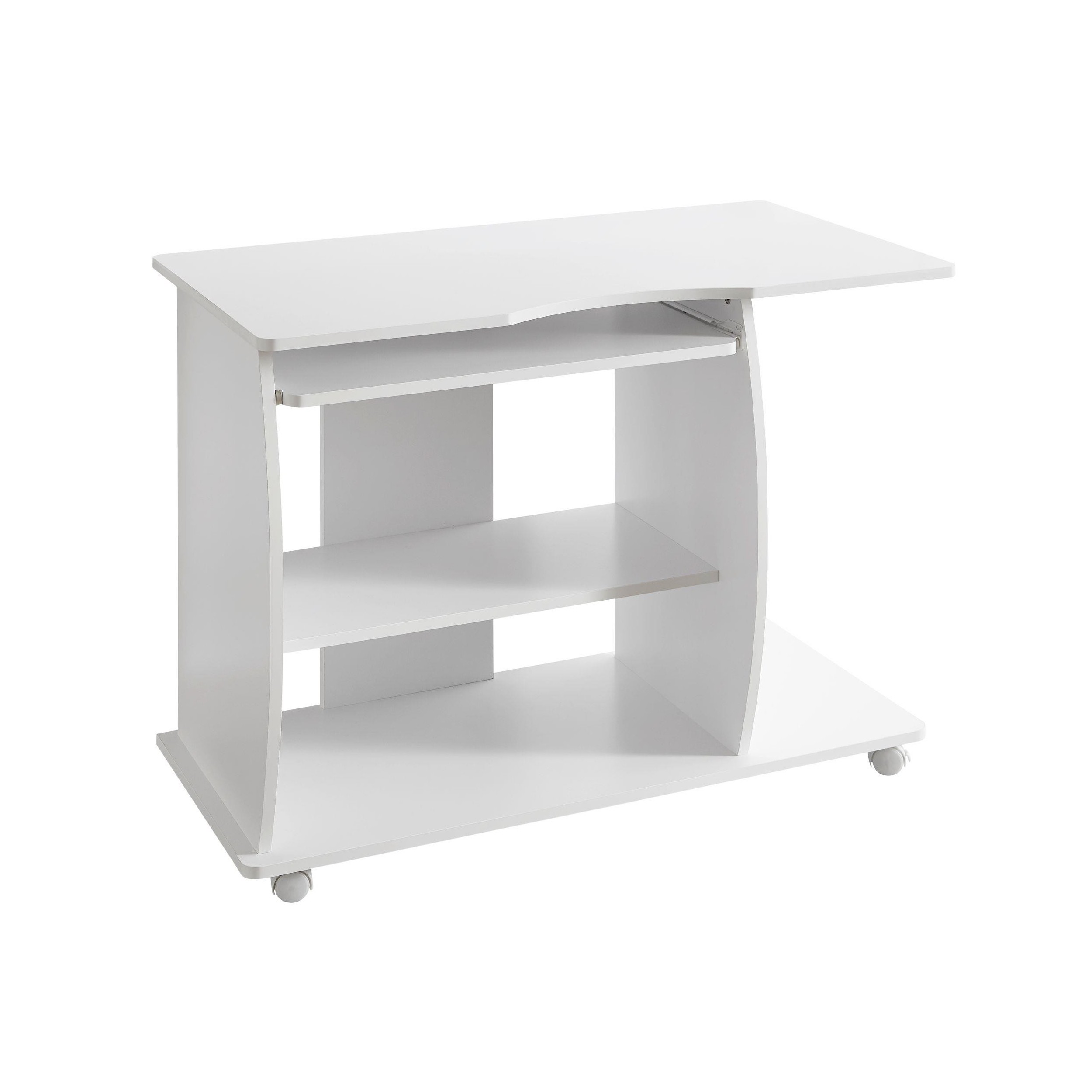 Mesa de Ordenador DUKE, bandeja para teclado y ruedas, en blanco