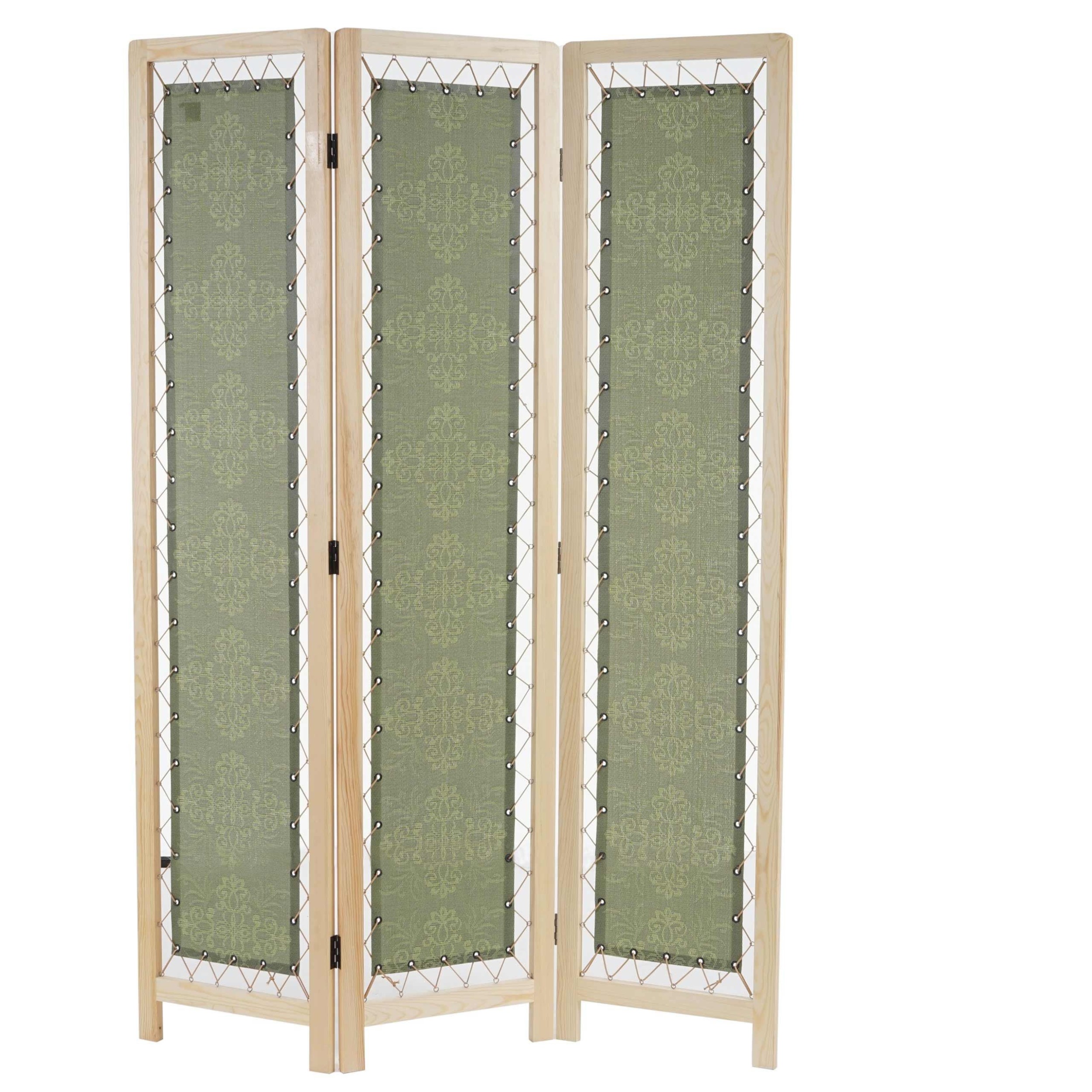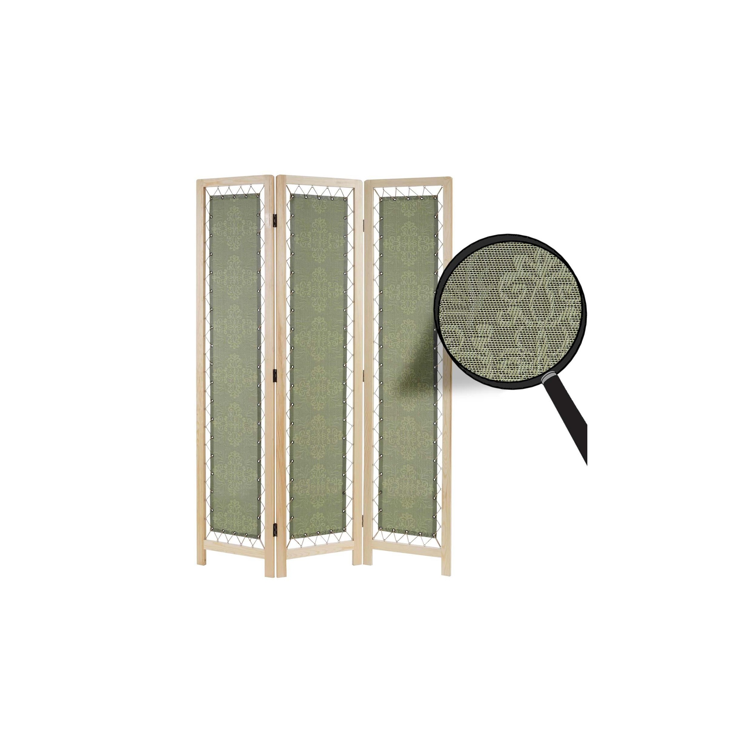 Este biombo de 3 paneles destaca por su diseño. Sus paneles están tapizados con una tela estampada de corte clásico fijada a la estructura del biombo con un cordón de goma. De esta manera, por ese espacio se permite el suficiente paso de luz para ambos lados del biombo.