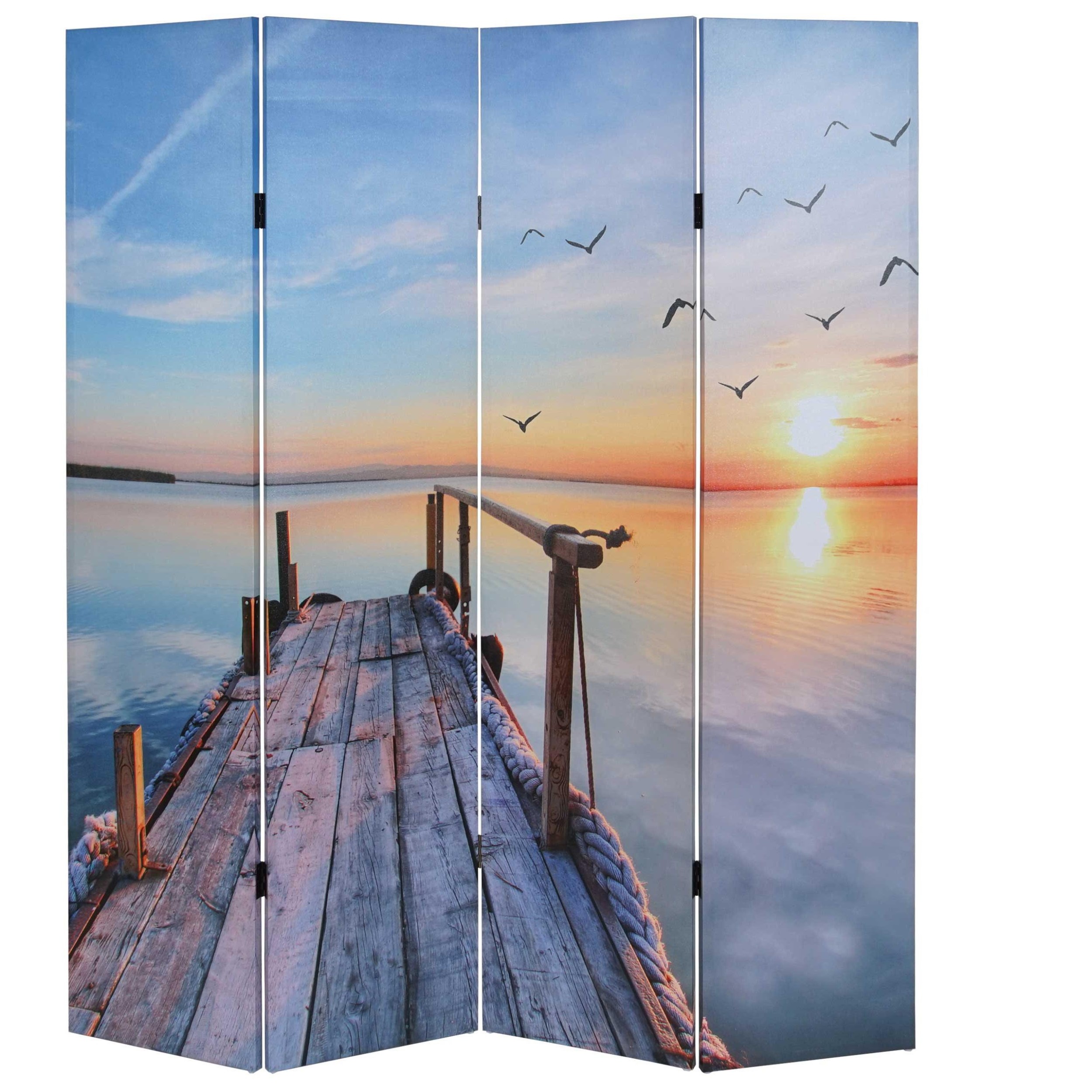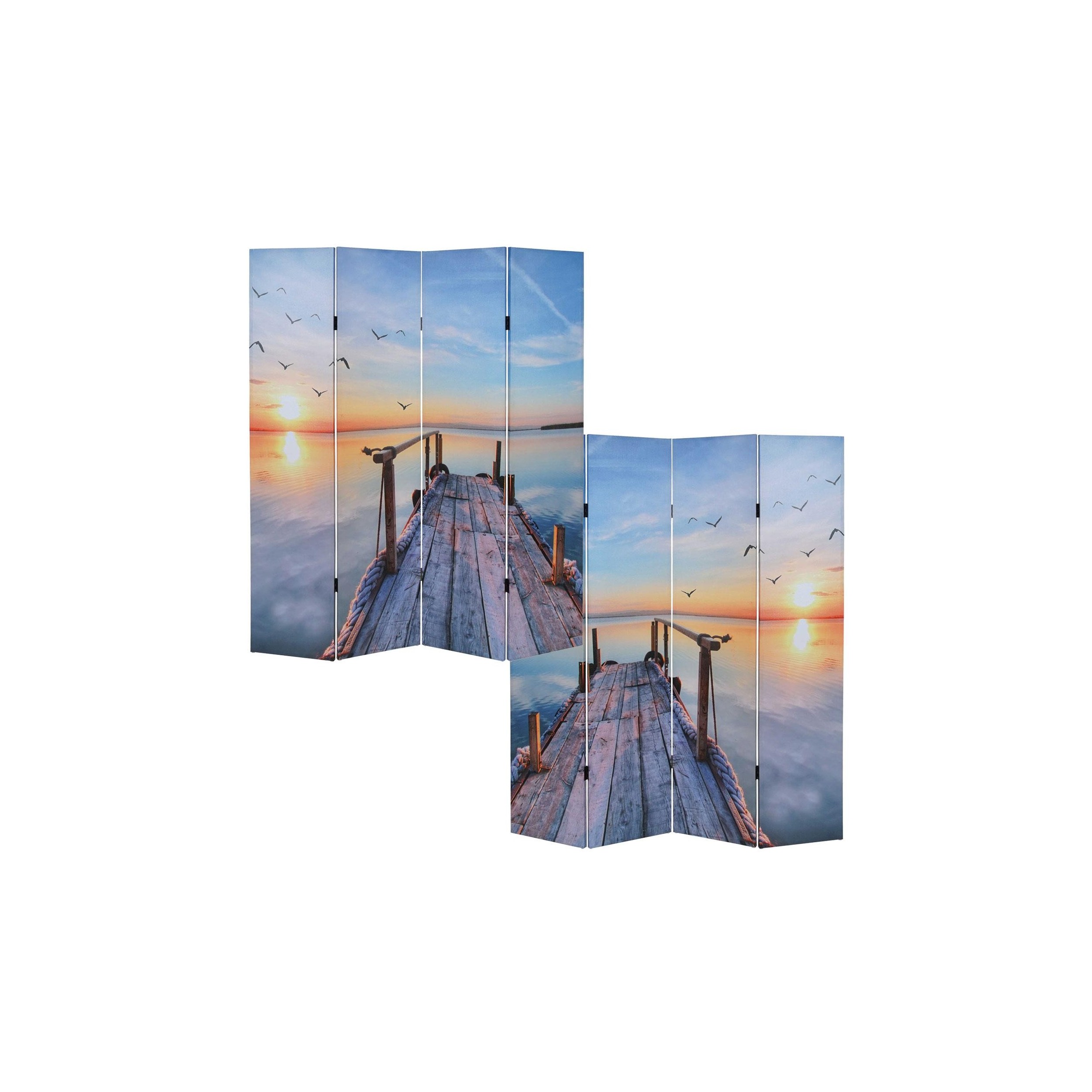 Este biombo decorativo de 4 paneles destaca por su diseño, que invita a trasladarse a una tarde de verano frente a un embarcadero mientras disfrutas del atardecer. Una imagen llena de calma y paz que te invitará a relajarte.