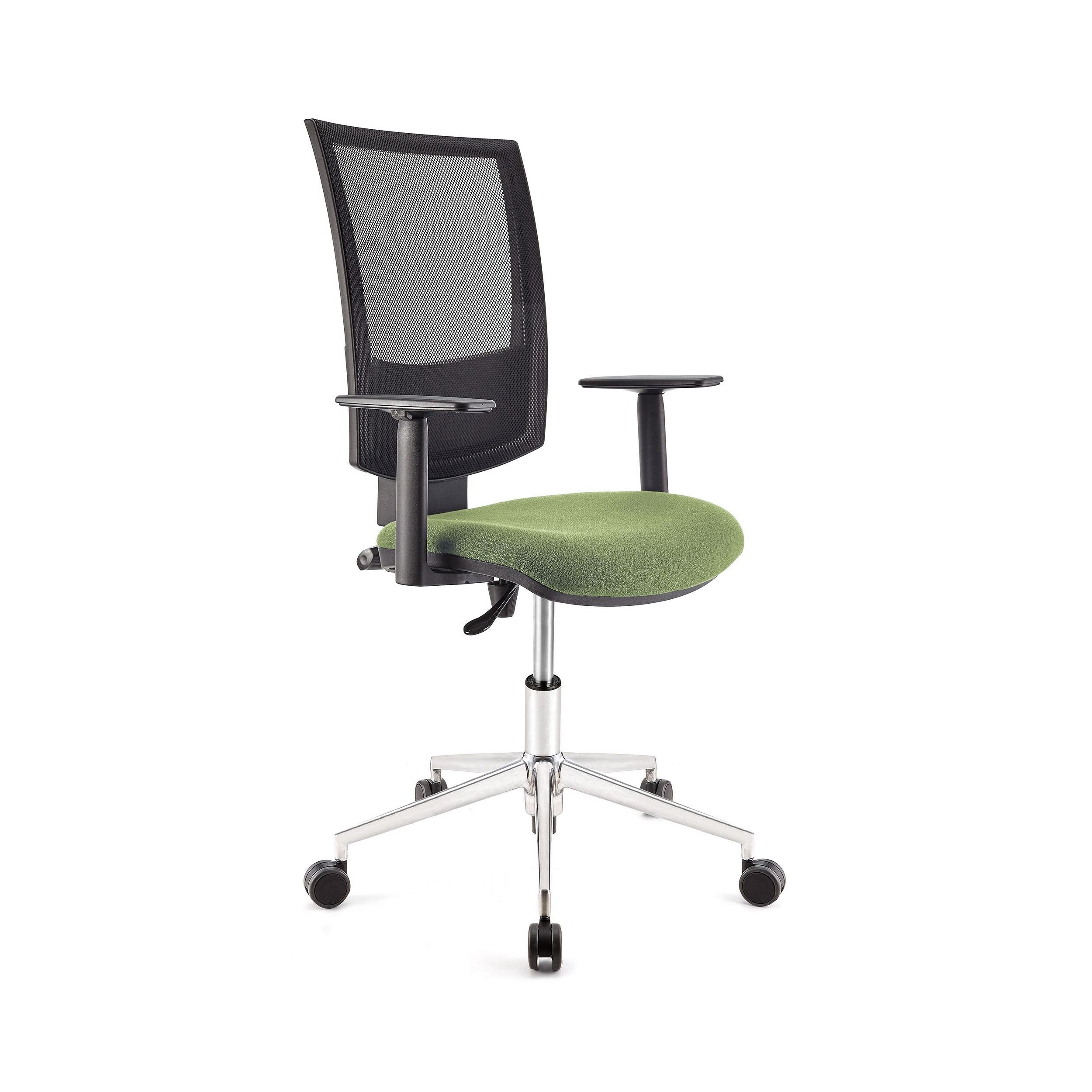 Silla FLASH, respaldo MALLA, asiento tela BALI verde, brazos ajustables, base metal