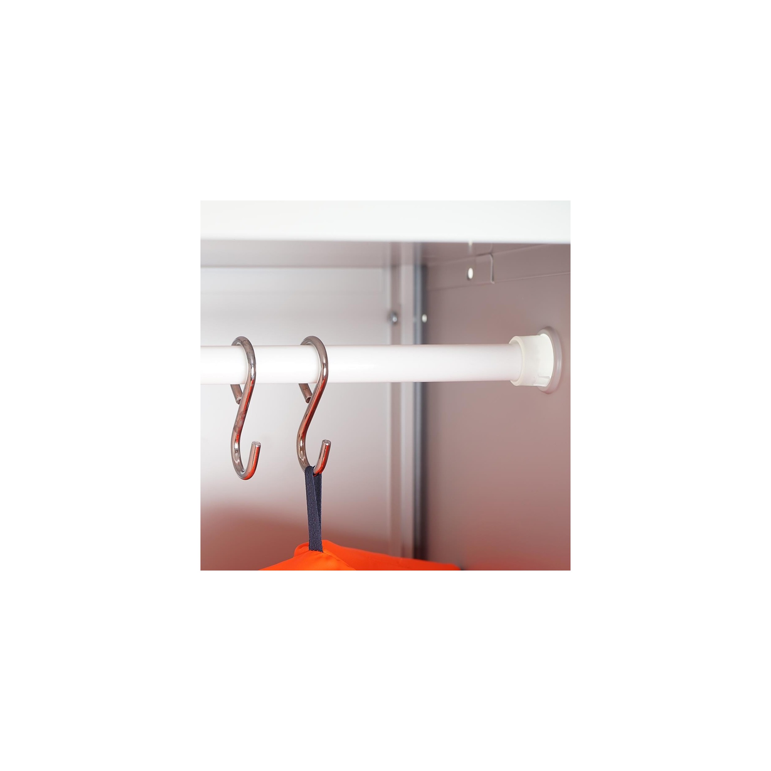 Estamos ante un armario de grandes dimensiones, 183x30x50 cm, por lo que ofrece una considerable capacidad de almacenaje. Cuenta con un estante y una barra para colgar con 3 ganchos, por lo que cada persona podrá guardar sus enseres o carpetas sin interferir en las del resto.
