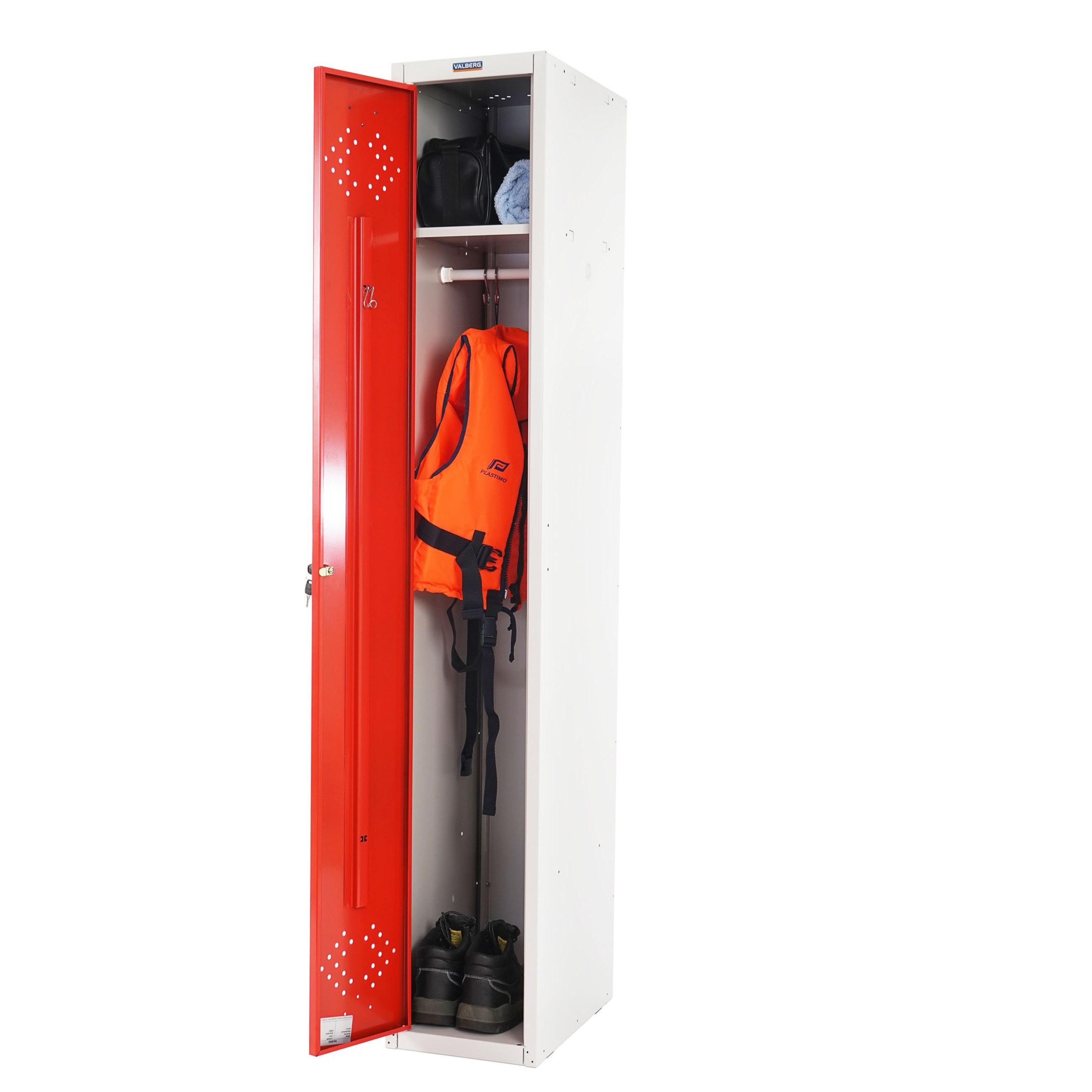 Te presentamos la taquilla BERIT 1 PUERTA. Se trata de un robusto armario con un estante y una barra de colgar con 3 ganchos fabricado en acero y disponible en varios colores.