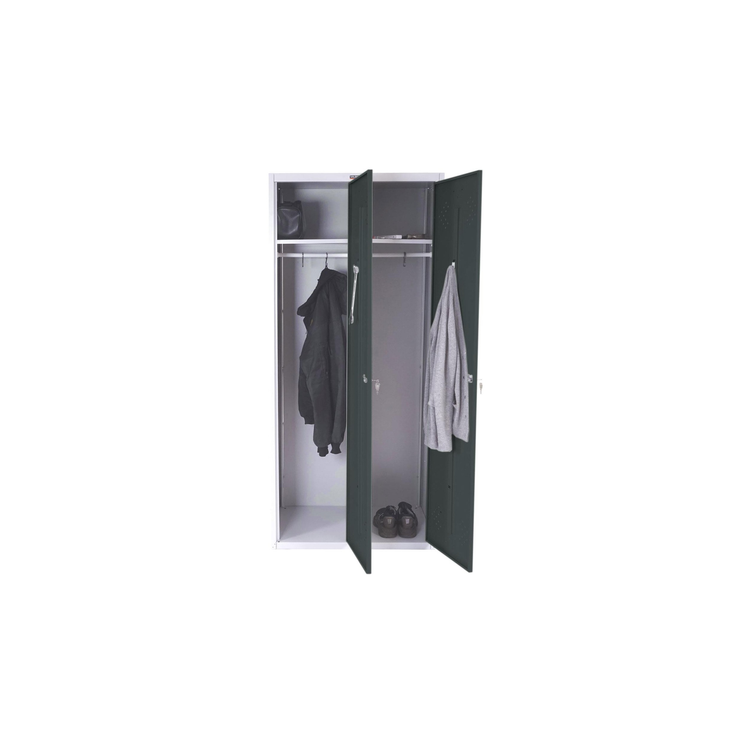 Te presentamos la taquilla FRIDA con 2 puertas. Se trata de un robusto armario con un estante y barra de colgar con 4 ganchos, fabricado en acero