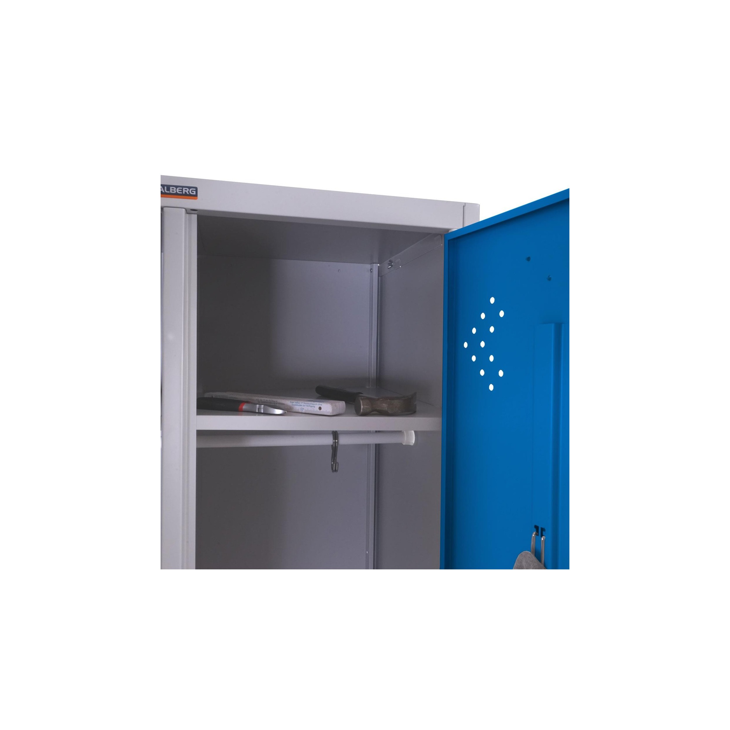 Estamos ante un armario de grandes dimensiones, 183x81x50 cm, por lo que ofrece una considerable capacidad de almacenaje. Cuenta con un estante y una barra para colgar con 4 ganchos, por lo que cada persona podrá guardar sus enseres o carpetas sin interferir en las del resto.
