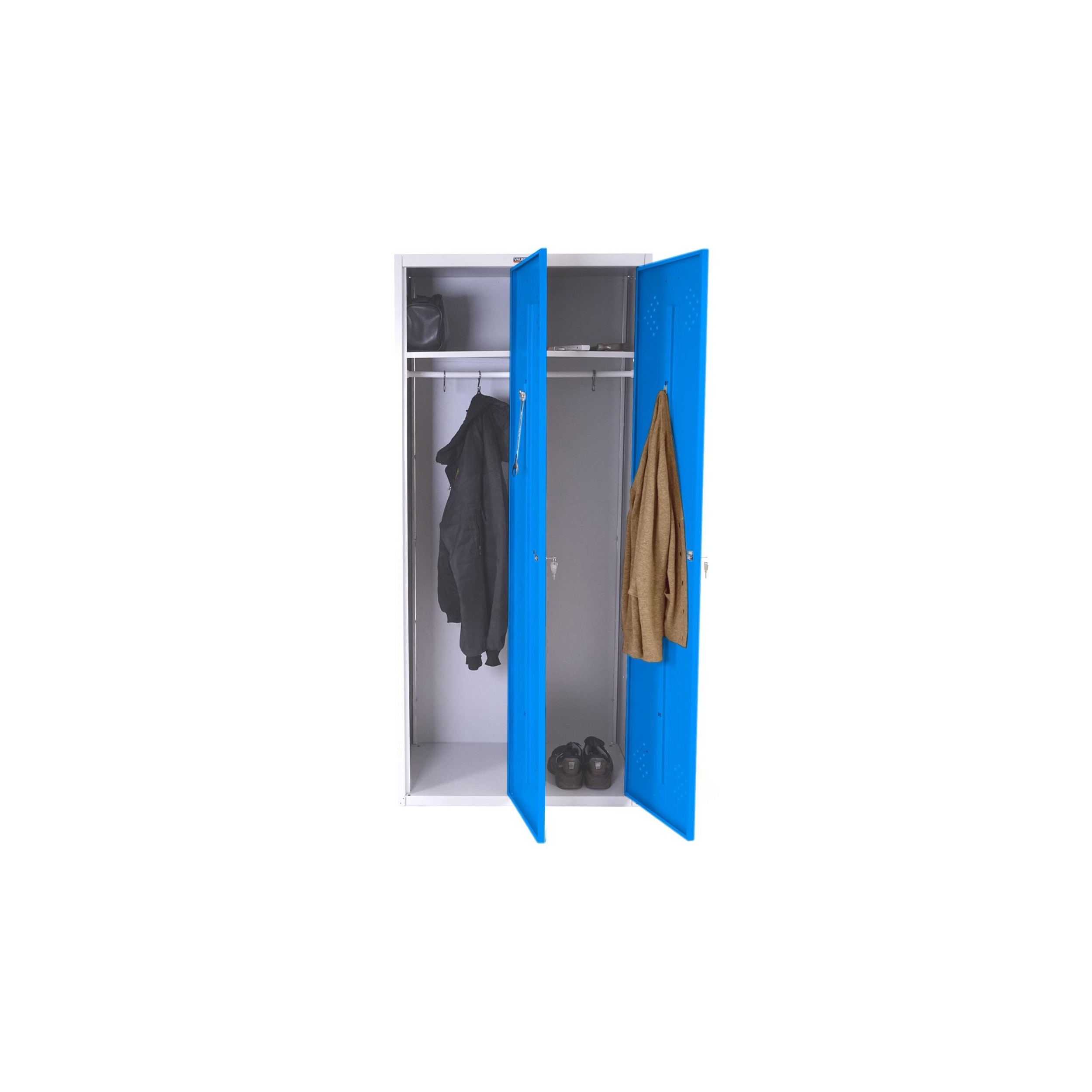 Te presentamos la taquilla FRIDA con 2 puertas. Se trata de un robusto armario con un estante y barra de colgar con 4 ganchos, fabricado en acero