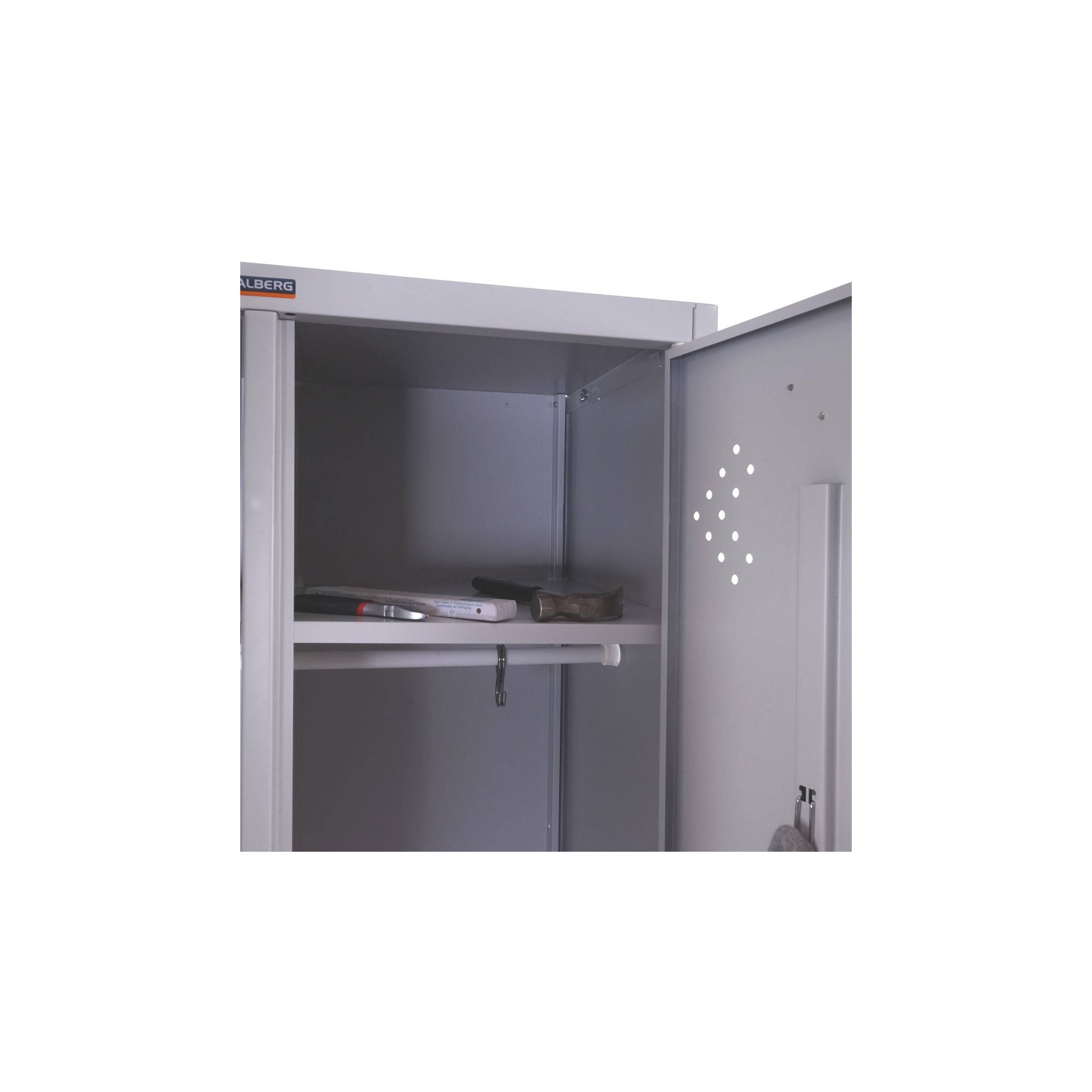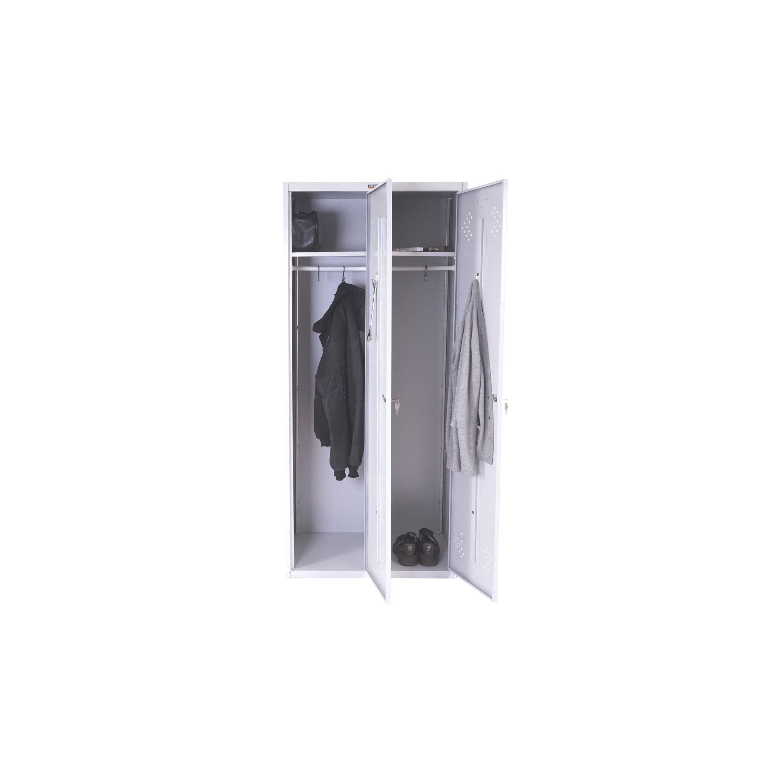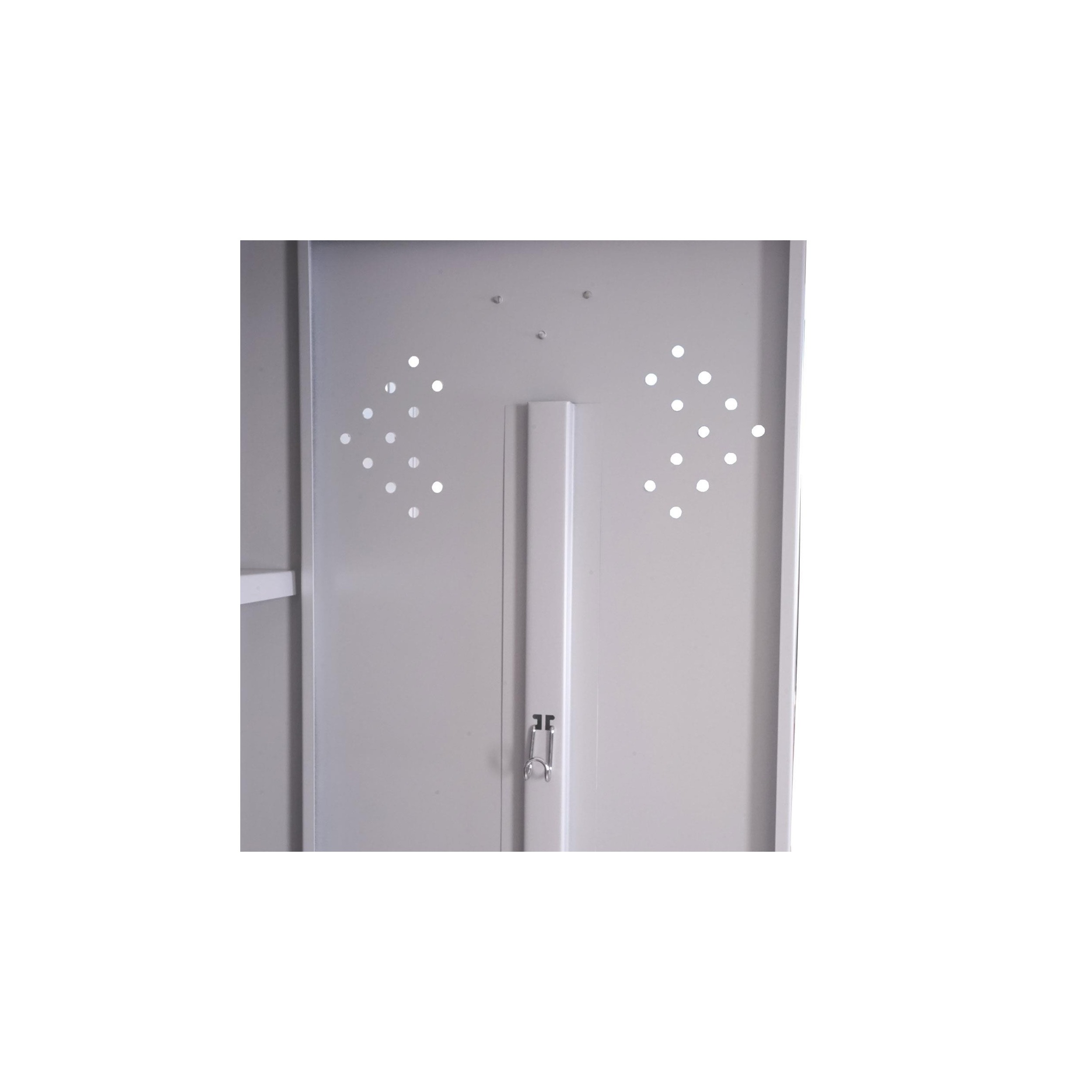 Estamos ante un armario de grandes dimensiones, 183x81x50 cm, por lo que ofrece una considerable capacidad de almacenaje. Cuenta con un estante y una barra para colgar con 4 ganchos, por lo que cada persona podrá guardar sus enseres o carpetas sin interferir en las del resto.