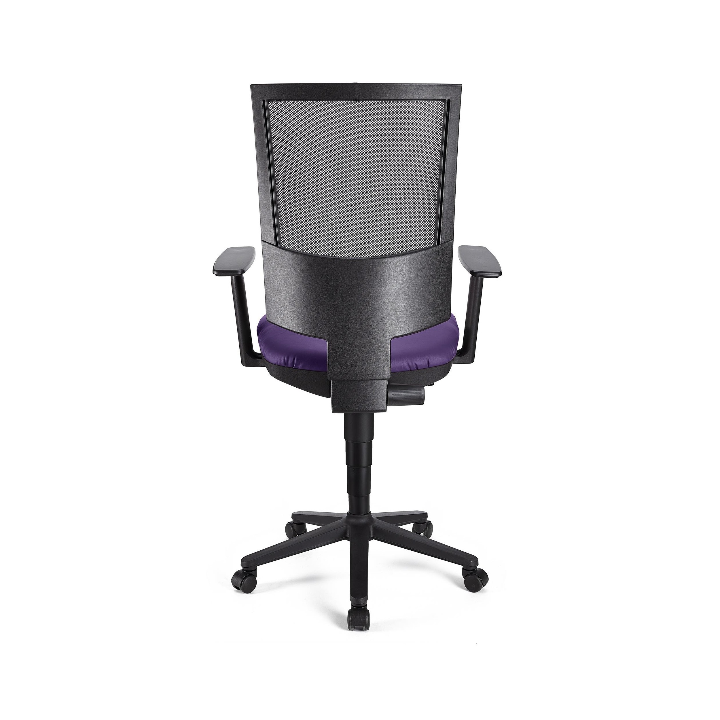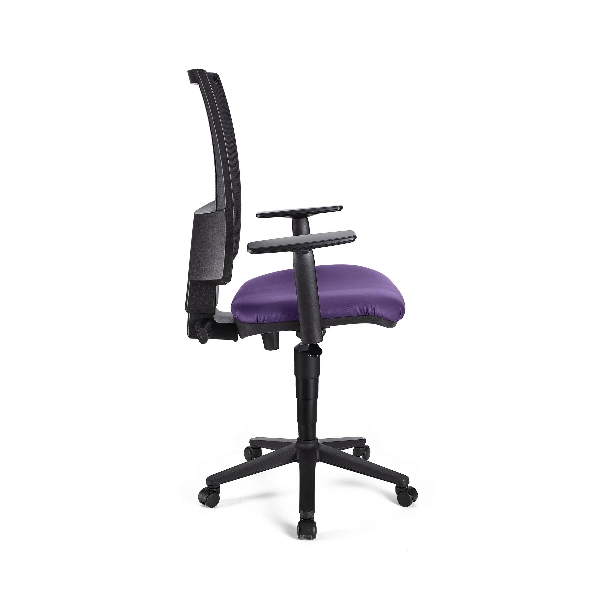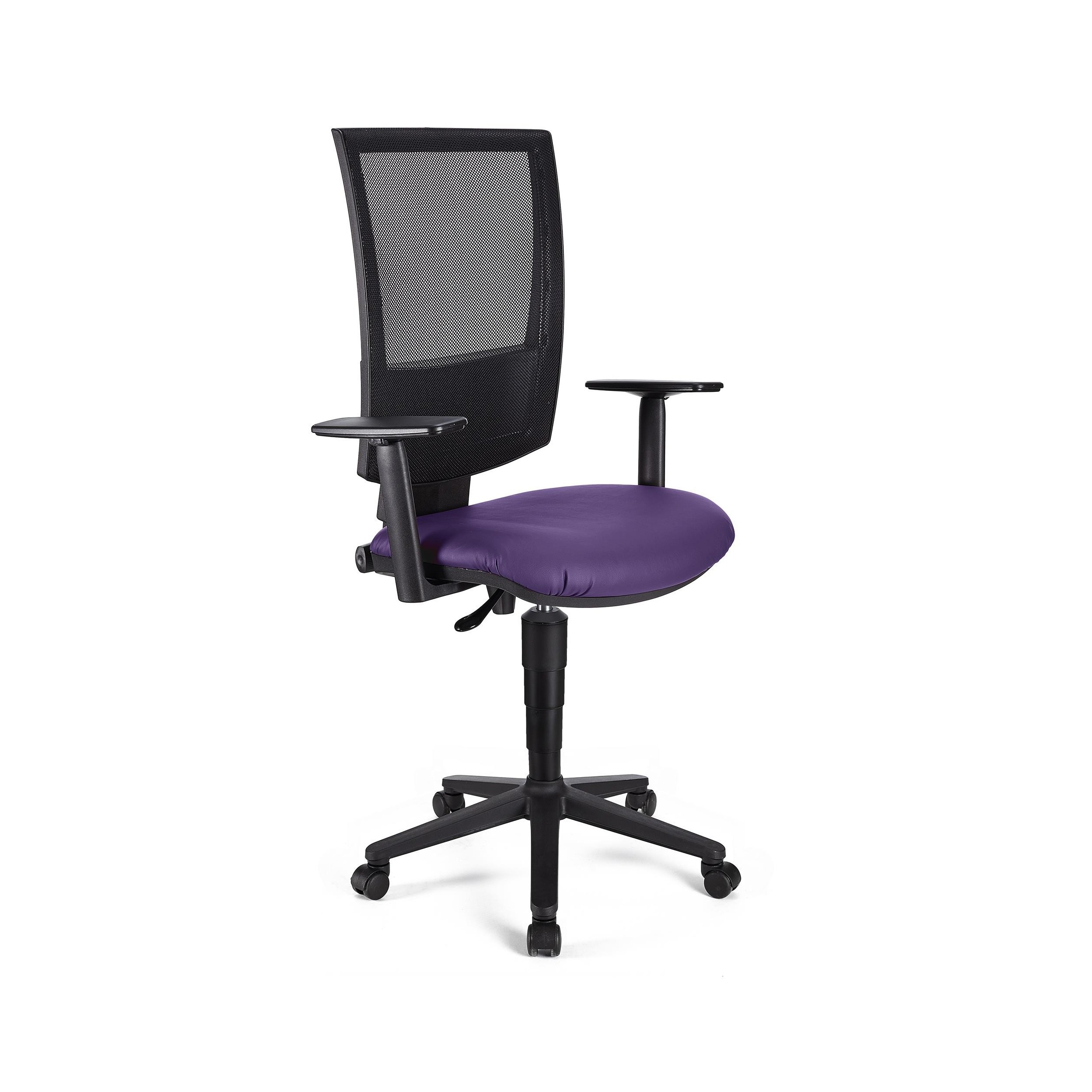 Silla FLASH, respaldo MALLA, asiento piel morada, brazos ajustables, base plástico