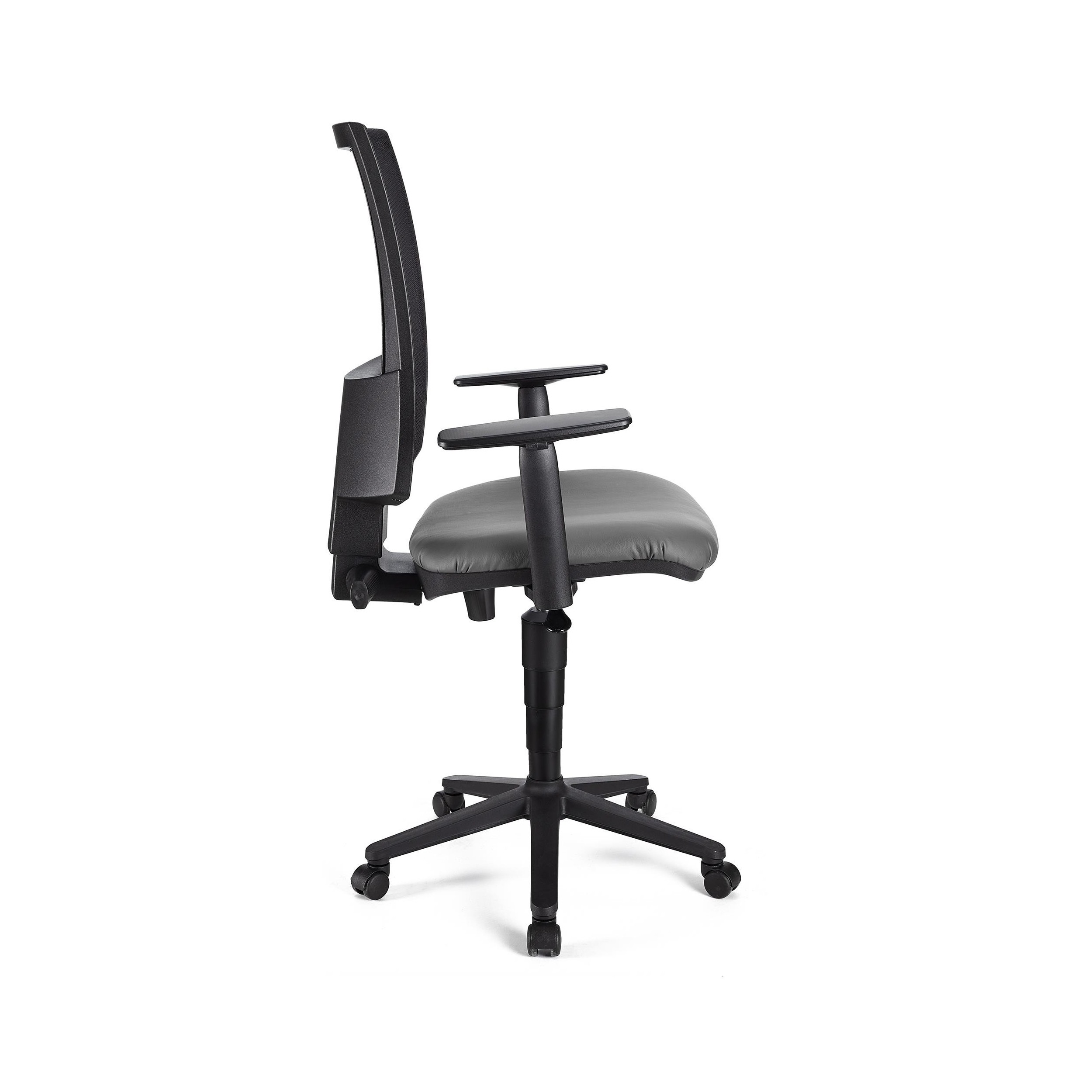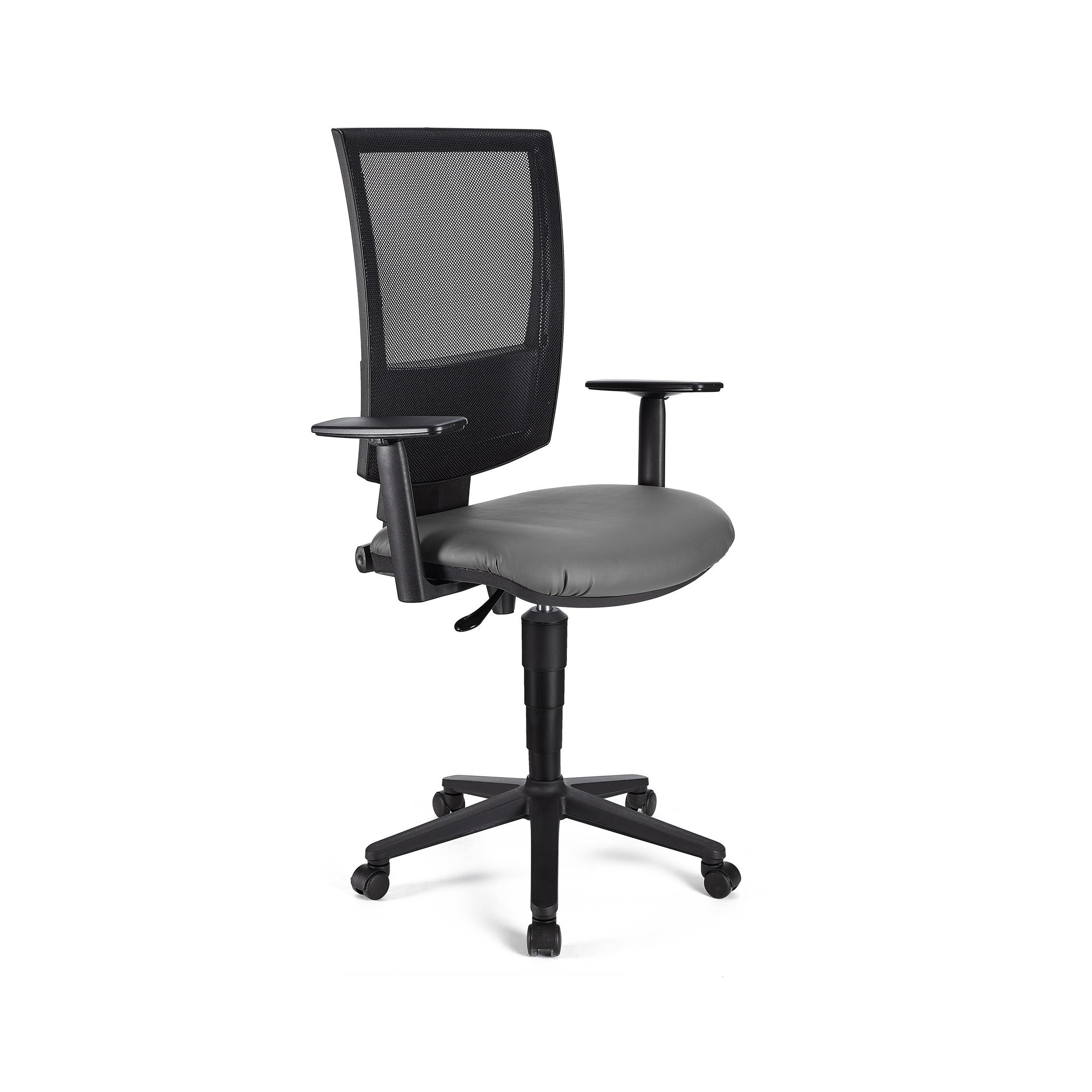 Silla FLASH, respaldo MALLA, asiento piel gris, brazos ajustables, base plástico