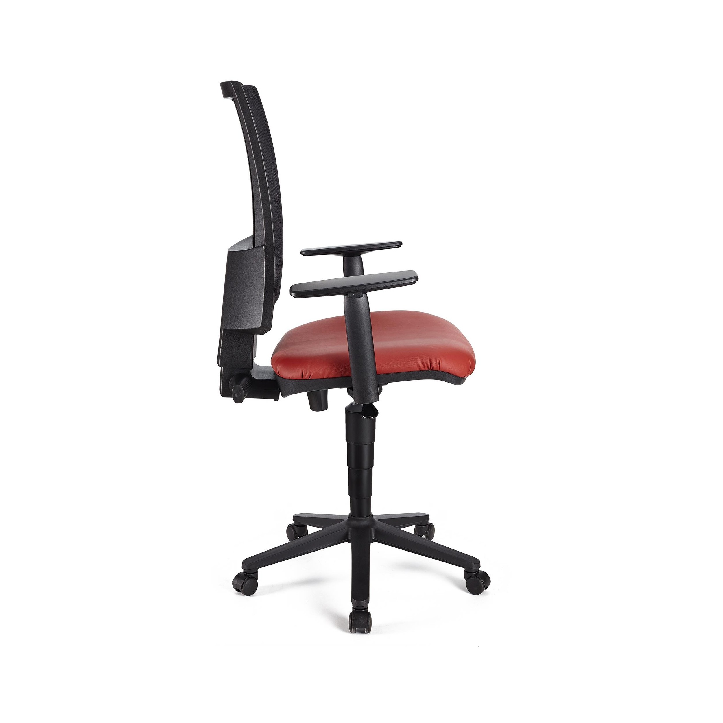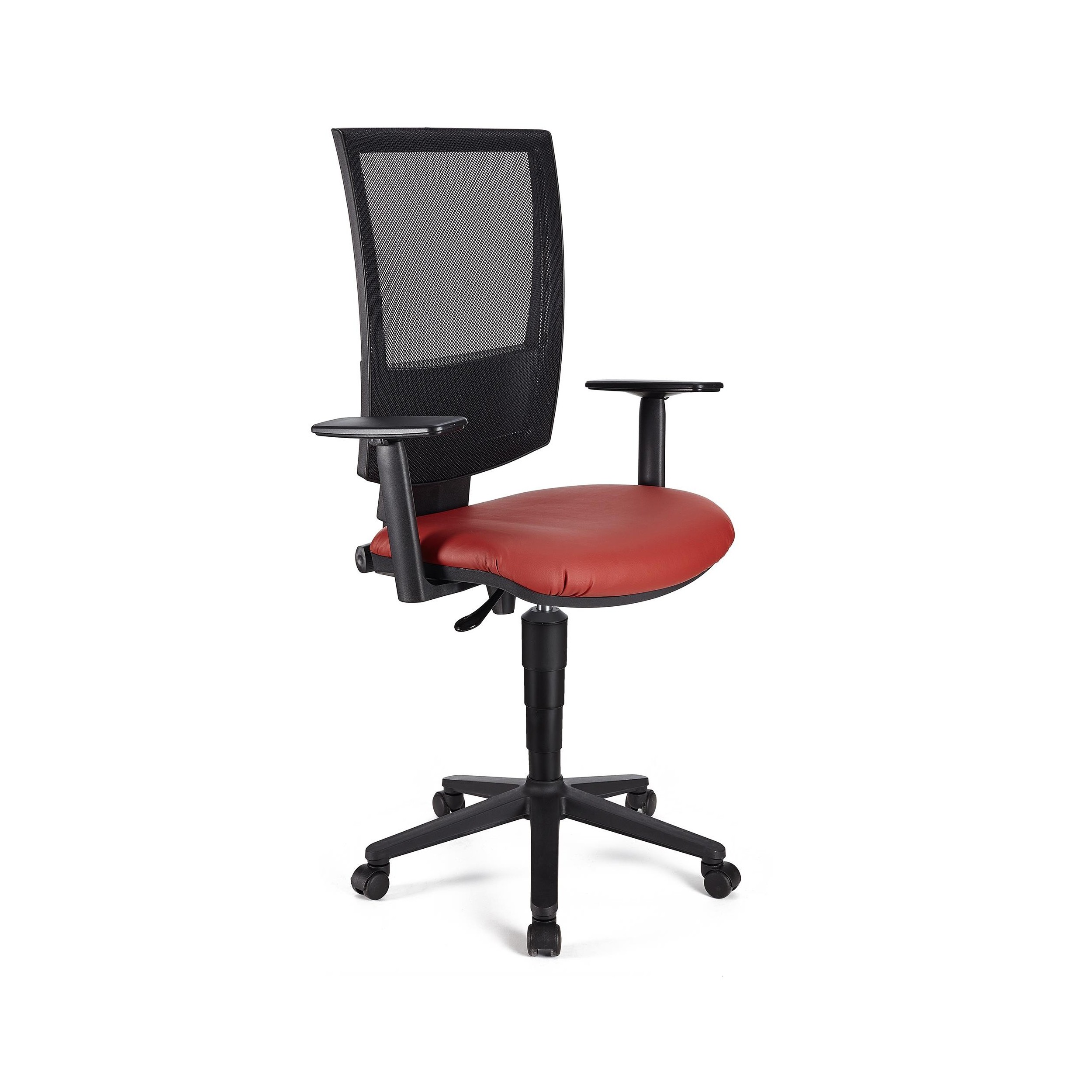 Silla FLASH, respaldo MALLA, asiento piel roja, brazos ajustables, base plástico