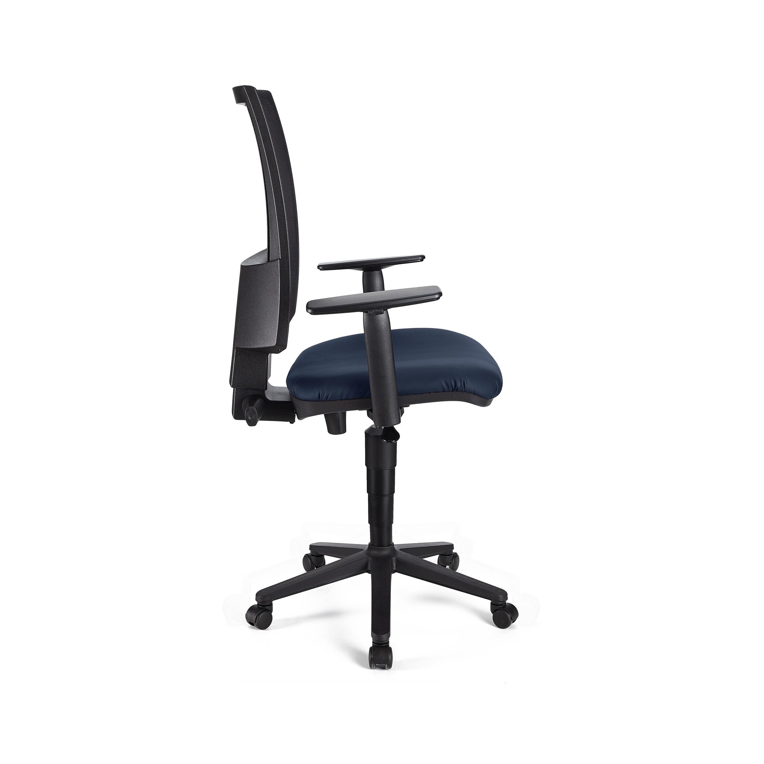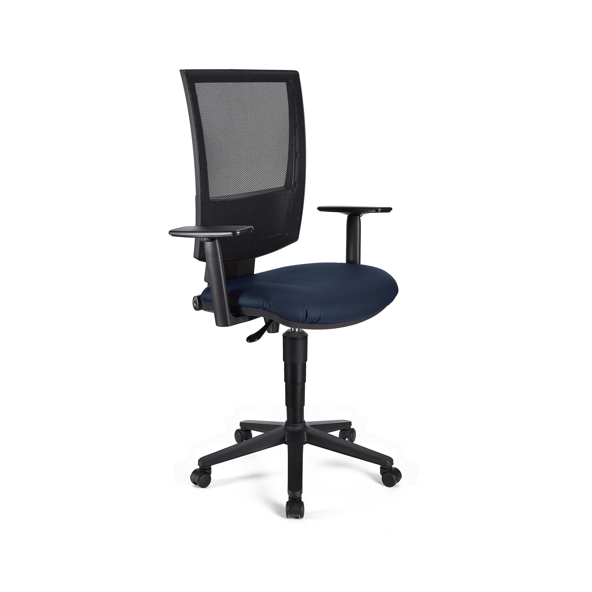 Silla FLASH, respaldo MALLA, asiento piel azul, brazos ajustables, base plástico