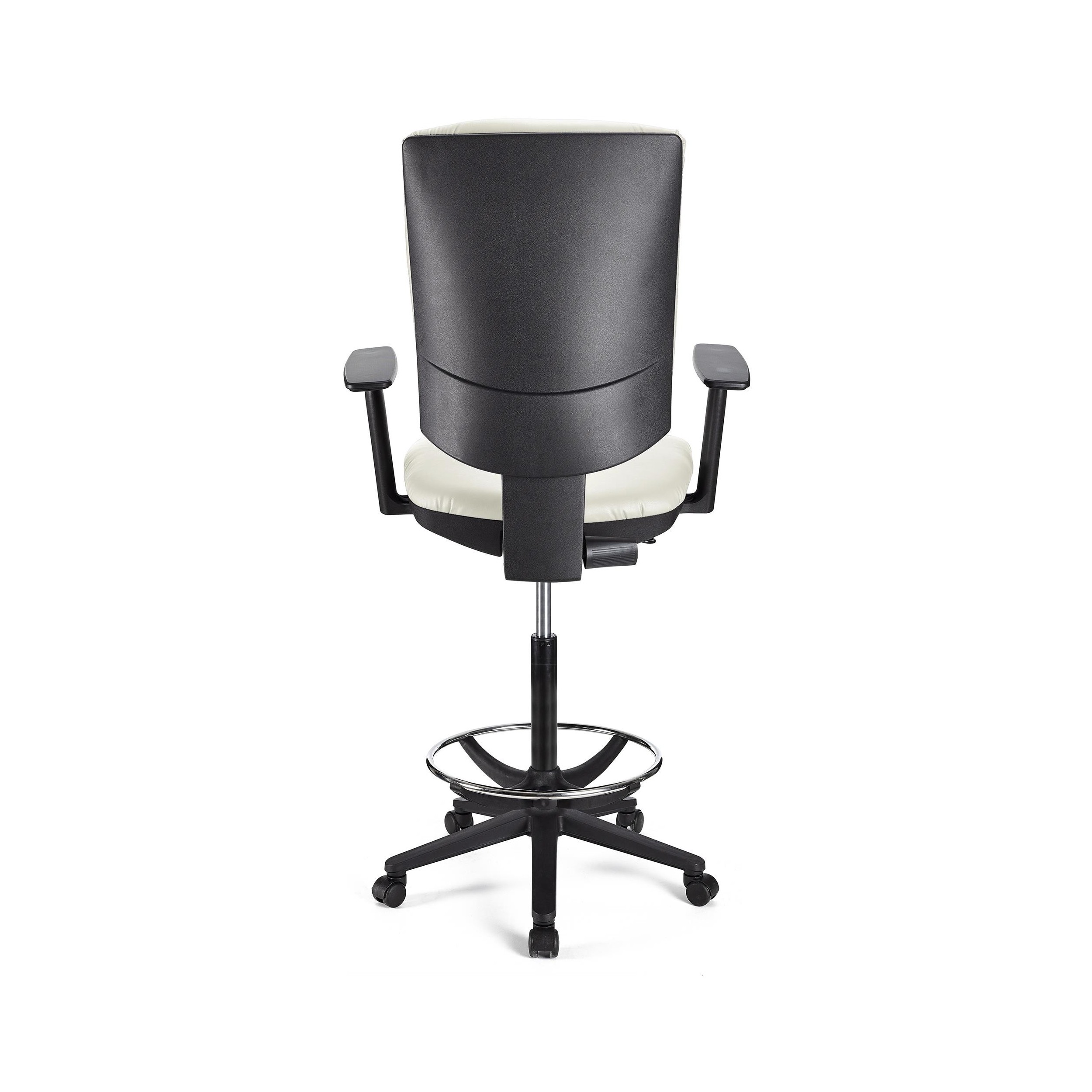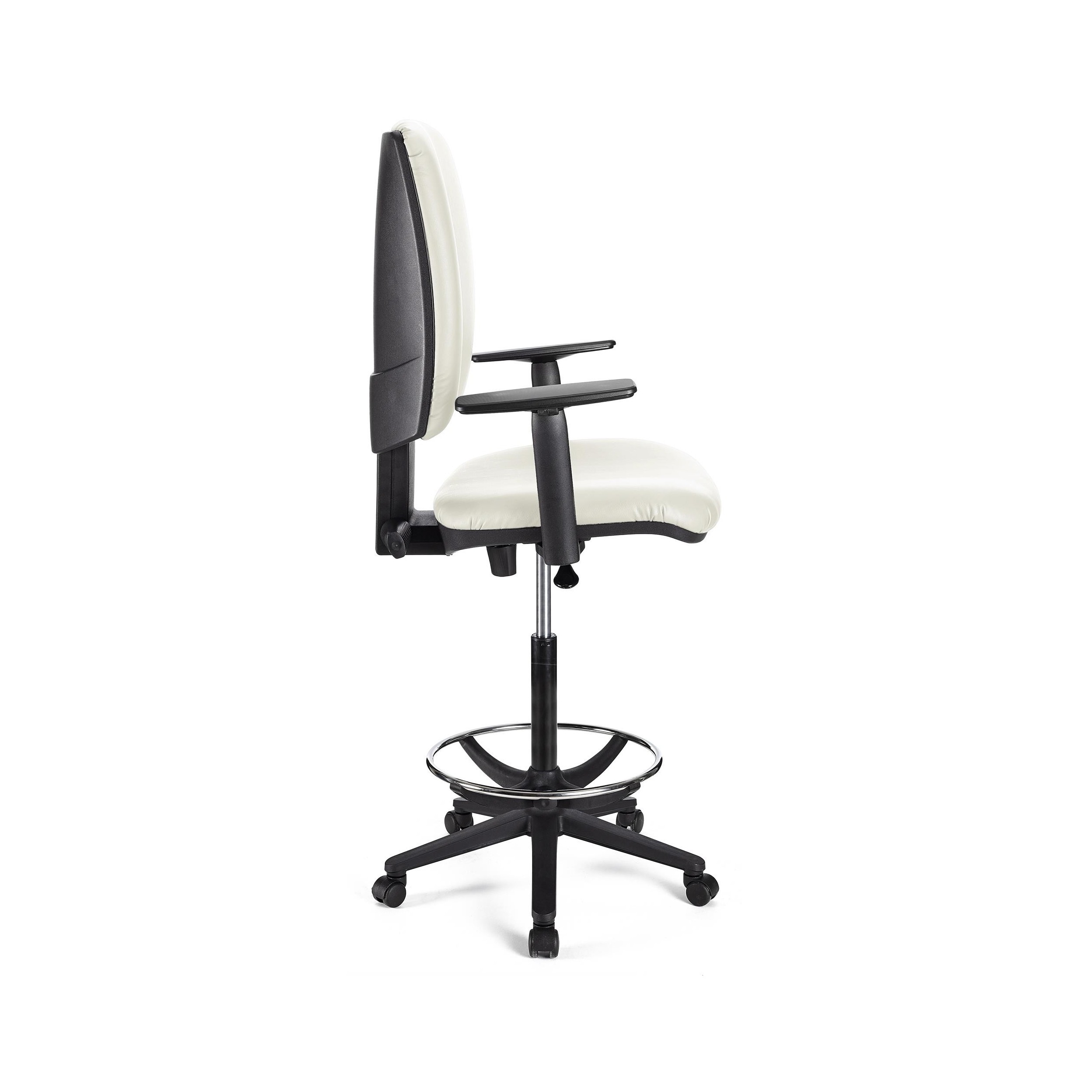 Taburete FLASH, respaldo y asiento piel blanca, brazos ajustables, base plástico