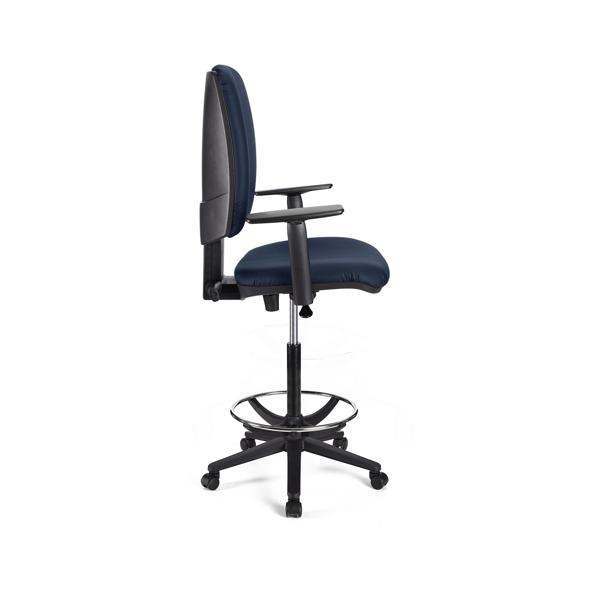 Taburete FLASH, respaldo y asiento piel azul, brazos ajustables, base plástico
