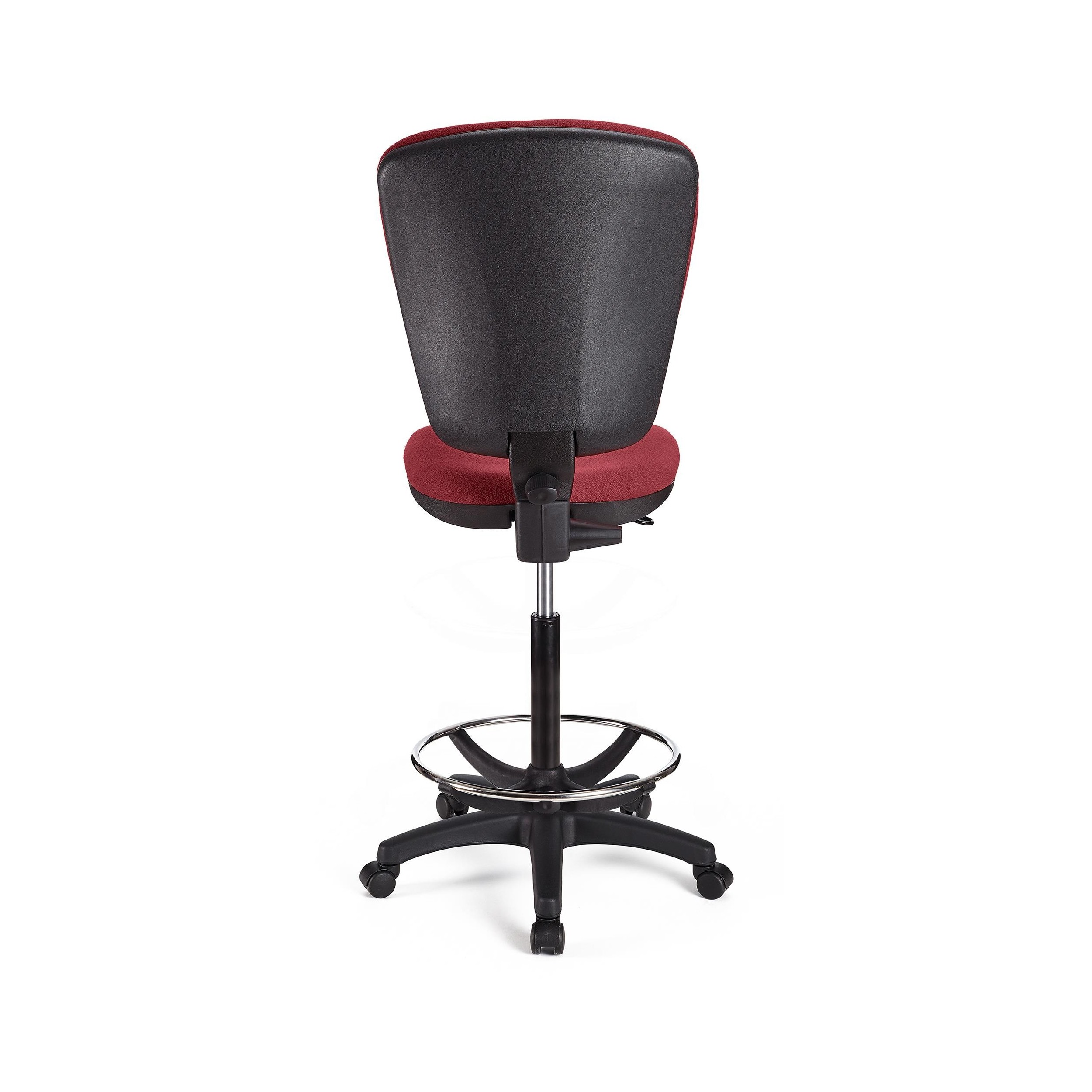 Taburete para uso profesional sin brazos tapizado en tela. Ajustable, con reposapiés, resistente y confortable.