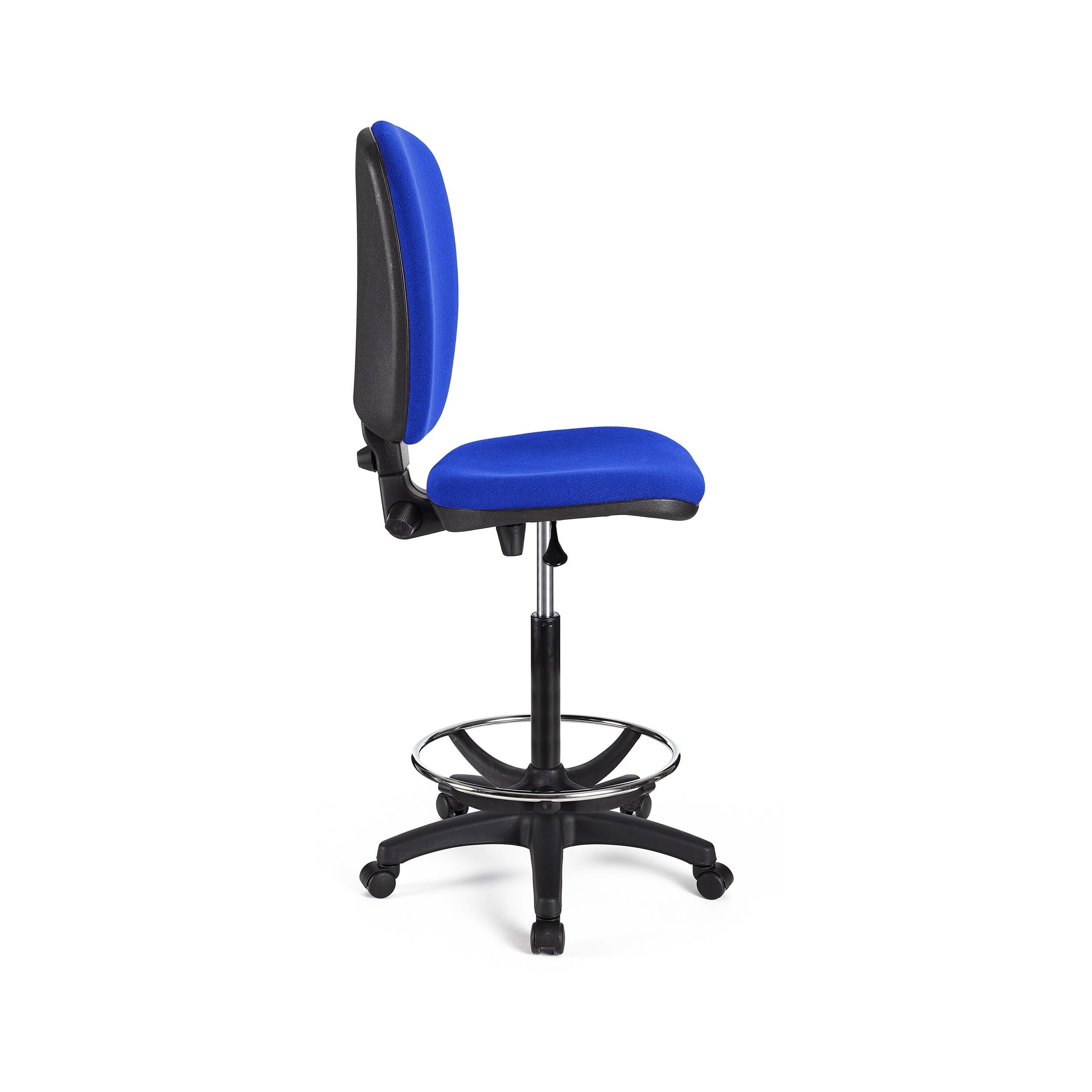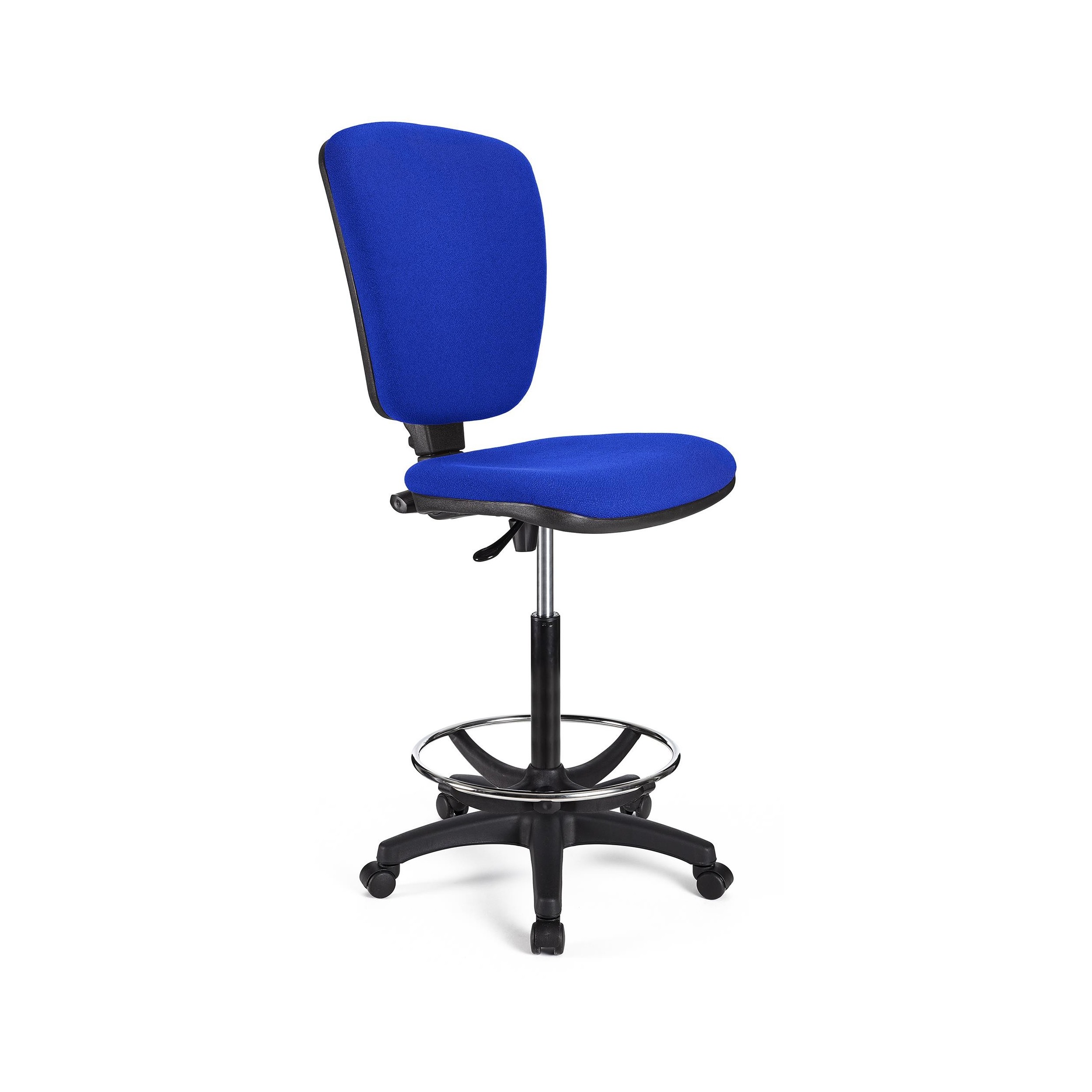 Taburete para uso profesional sin brazos tapizado en tela. Ajustable, con reposapiés, resistente y confortable.