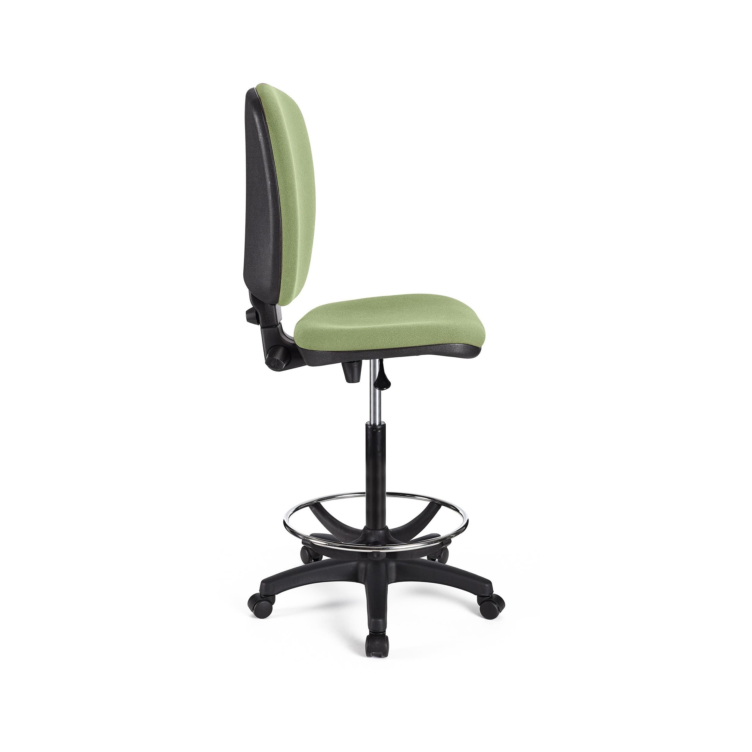 Taburete para uso profesional sin brazos tapizado en tela. Ajustable, con reposapiés, resistente y confortable.