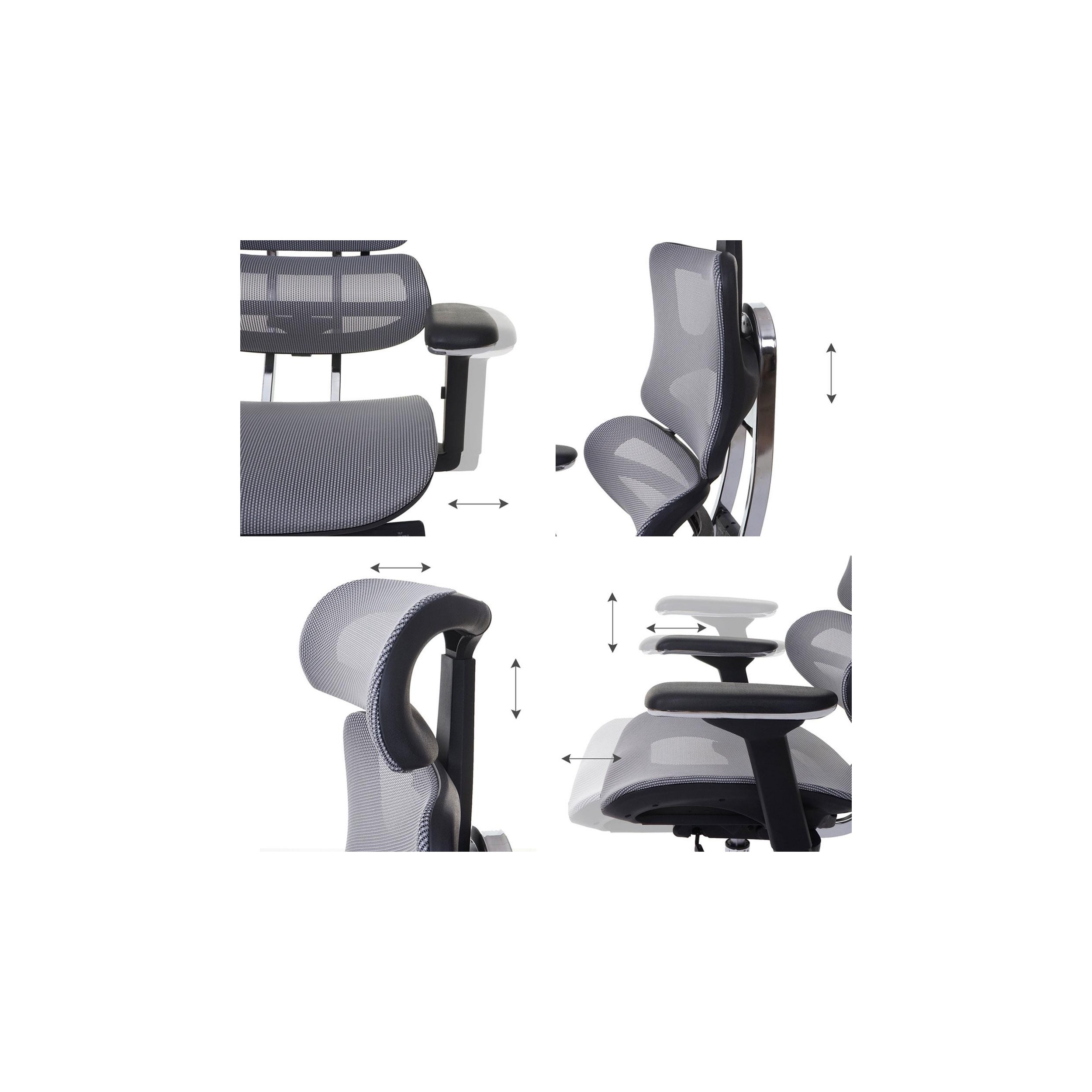 Por supuesto, también los brazos son ajustables en altura, ángulo y profundidad. El reposacabezas se puede ajustar en altura y ángulo. Todas estas carácteristicas son muy utiles para que la silla se ajuste al usuario y no al revés.