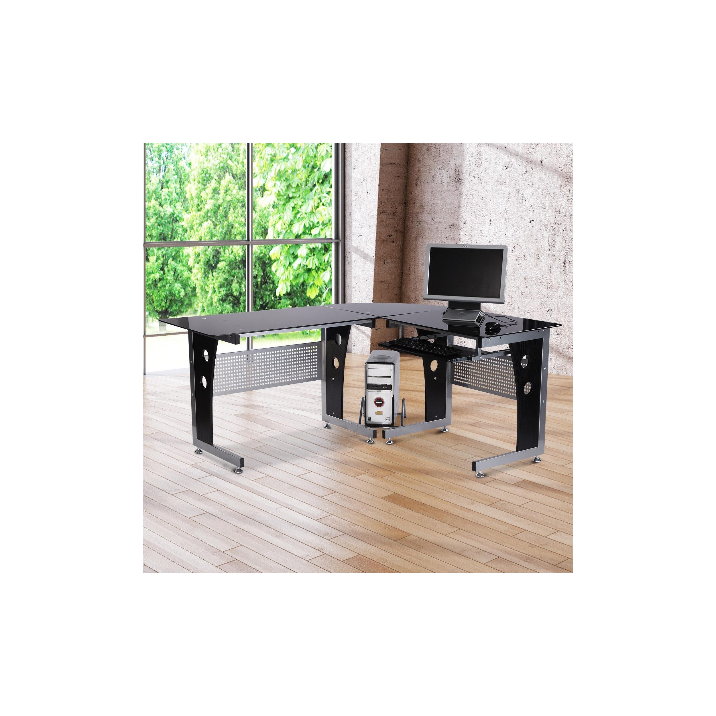 Mesa de Oficina VOCAR, 164x139x75 cm, con Bandeja para Teclado, en Madera y Cristal color Negro