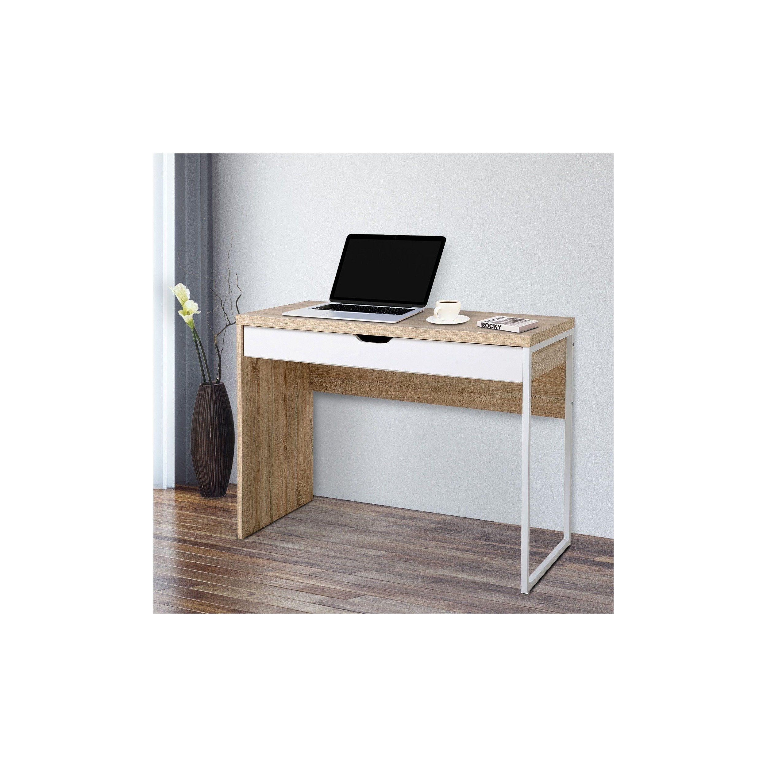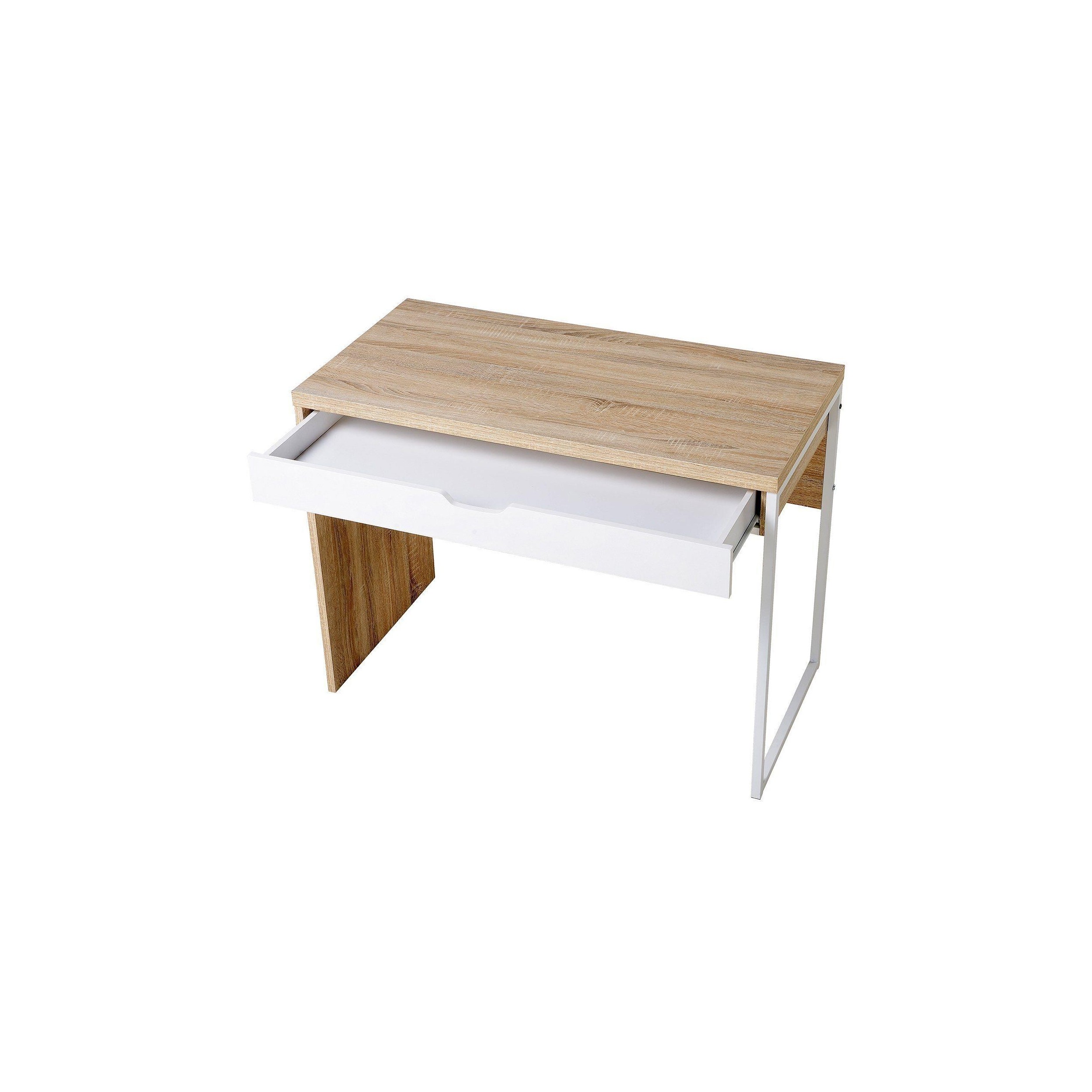 Mesa para Ordenador HANS, con Cajón, 100x50x75 cm, en Madera color Roble y Blanco