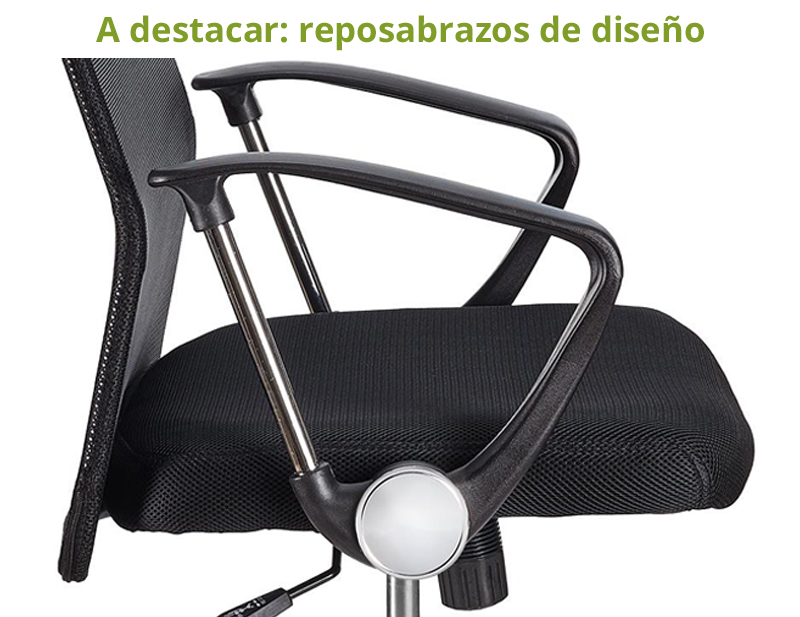 El respaldo tiene diseño ergonómico, es muy alto y está tapizado en malla transpirable, un tejido muy agradable y resistente. Incorpora un soporte lumbar y además cuenta con un exclusivo mecanismo basculante con el que podrás elegir si fijar el respaldo o dejarlo en posición móvil.
