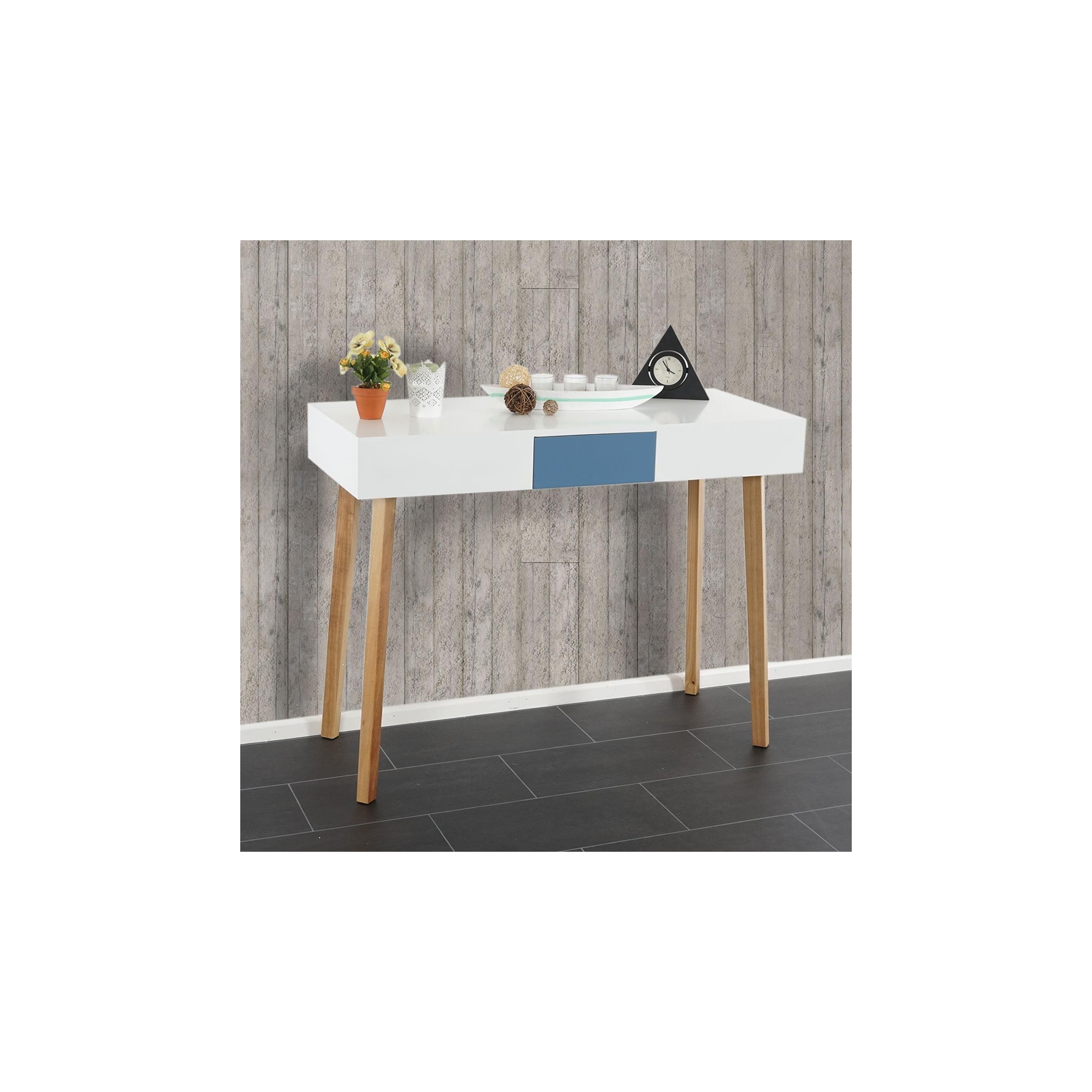 Desde el punto de vista práctico, esta mesa tiene el tamaño perfecto para el trabajo diario. Ofrece una superficie de trabajo útil de 120 cm de ancho y 55 de profundidad, lo que la convierte en un modelo inmejorable en dimensiones y uso. Además, dispone de un cajón lacado en color azul con tirador oculto en el que poder guardar las cosas que no queremos que estén visibles, pero que necesitamos tener a mano.