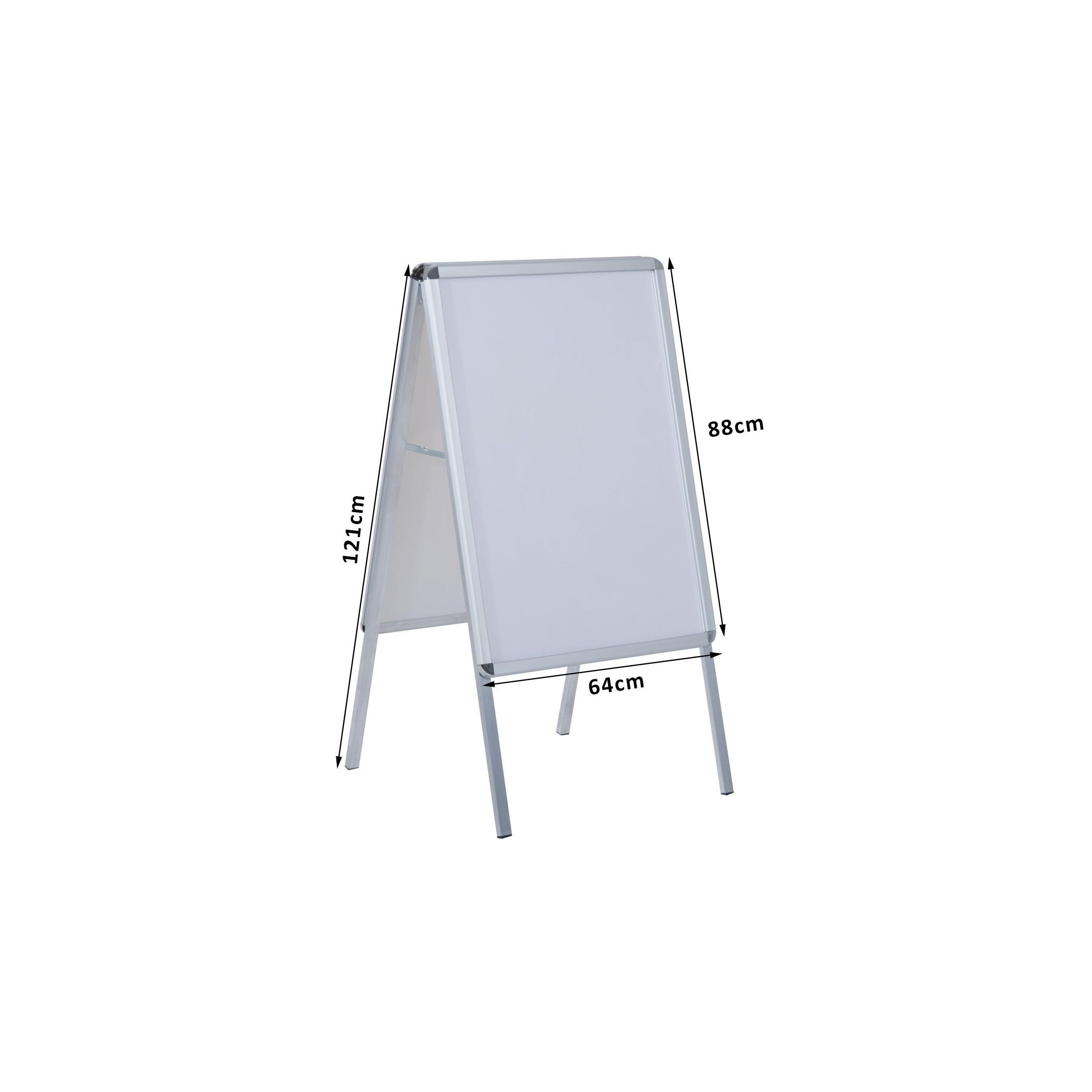 Este panel publicitario se puede adaptar y colocar en cualquier espacio. Es plegable, por lo que puede montarse y desmontarse fácilmente. Su doble cara permite colocar 2 carteles grandes tamaño DIN A1 que se pueden fijar fácilmente gracias a su sistema de apertura en clics en los 4 lados del marco. Además, tiene una lámina de plástico con recubrimiento anti-reflectante, perfecto para proteger los carteles y evitar esos molestos reflejos cuando se expone a la luz solar y lograr que los carteles sigan siendo legibles.