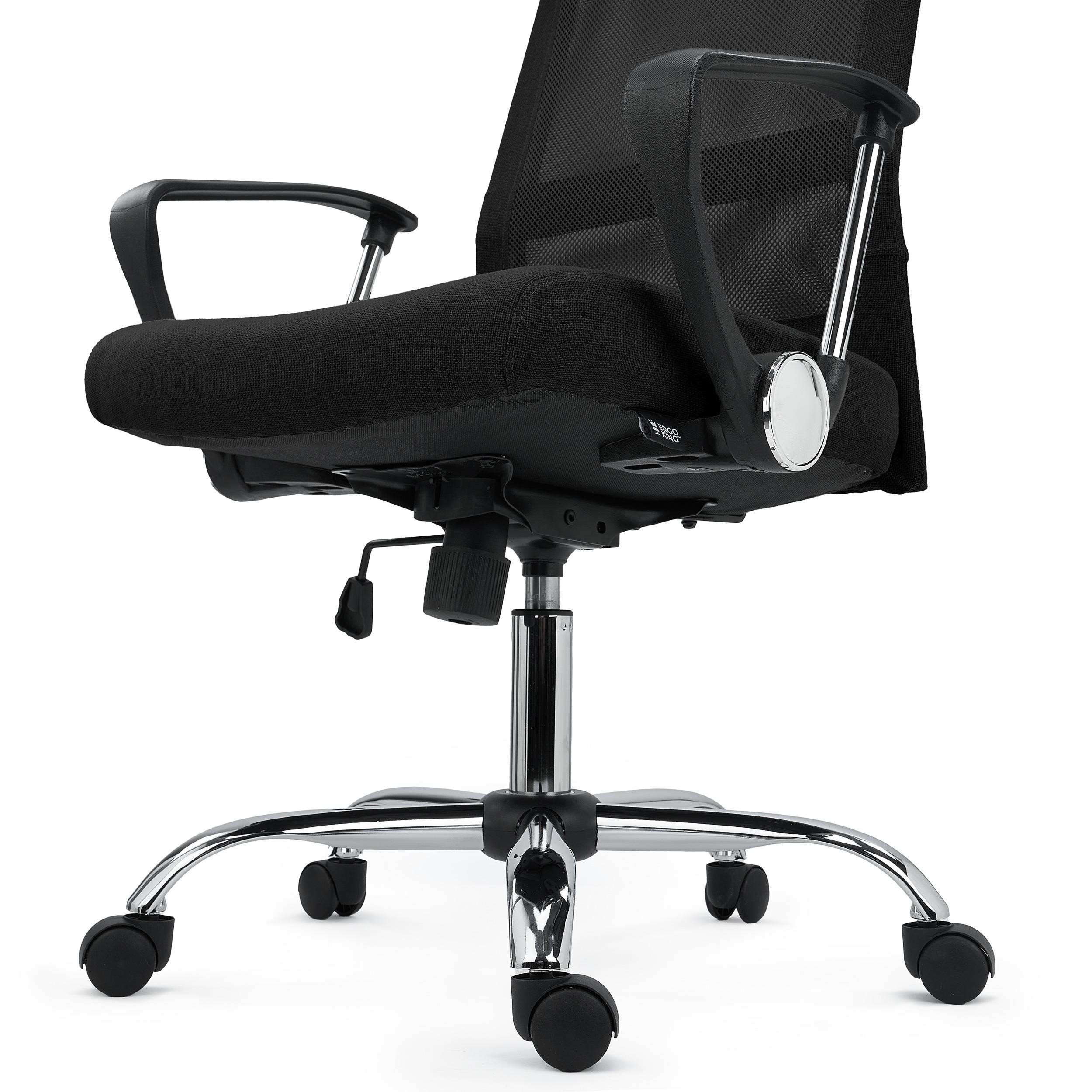 El respaldo tiene diseño ergonómico, es muy alto y está tapizado en malla transpirable, un tejido muy agradable y resistente. Incorpora un soporte lumbar y además cuenta con un exclusivo mecanismo basculante con el que podrás elegir si fijar el respaldo o dejarlo en posición móvil.