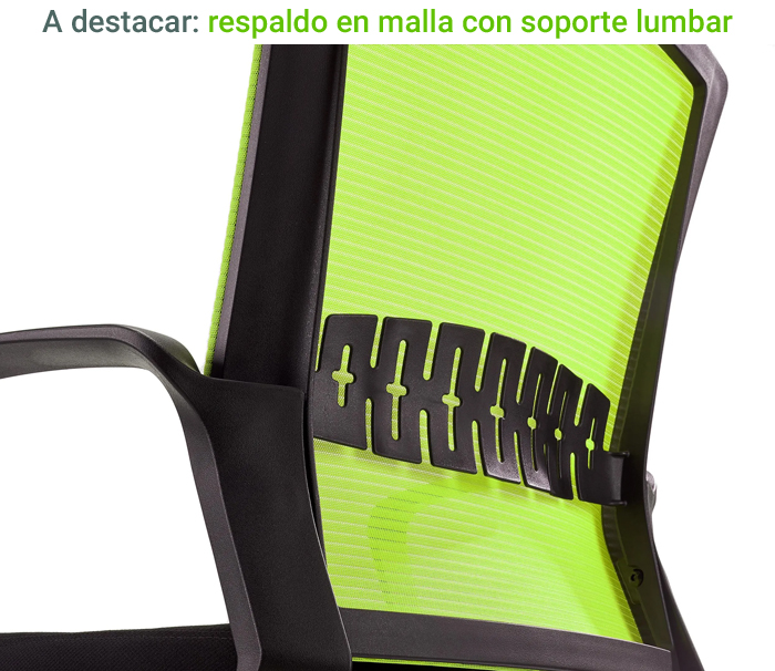 Lo más destacable es su soporte lumbar flexible. Un elemento muy de agradecer, ya que sujeta la zona inferior de la espalda, lo que permite un uso continuado con mayor comodidad. La malla 100% transpirable del respaldo es un material que combina una óptima ventilación con la mayor resistencia. De hecho, es hasta más resistente que la tela convencional.