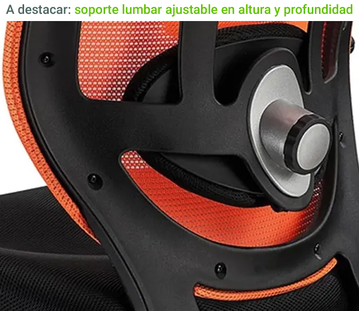 Uno de los aspectos clave de esta silla está en su respaldo: en malla transpirable y con soporte lumbar acolchado y ajustable en altura y profundidad. Un rasgo que marca la diferencia y que suma muchos puntos desde el punto de vista ergonómico. Gracias a esto tu espalda tendrá un buen apoyo y la postura corporal será óptima.